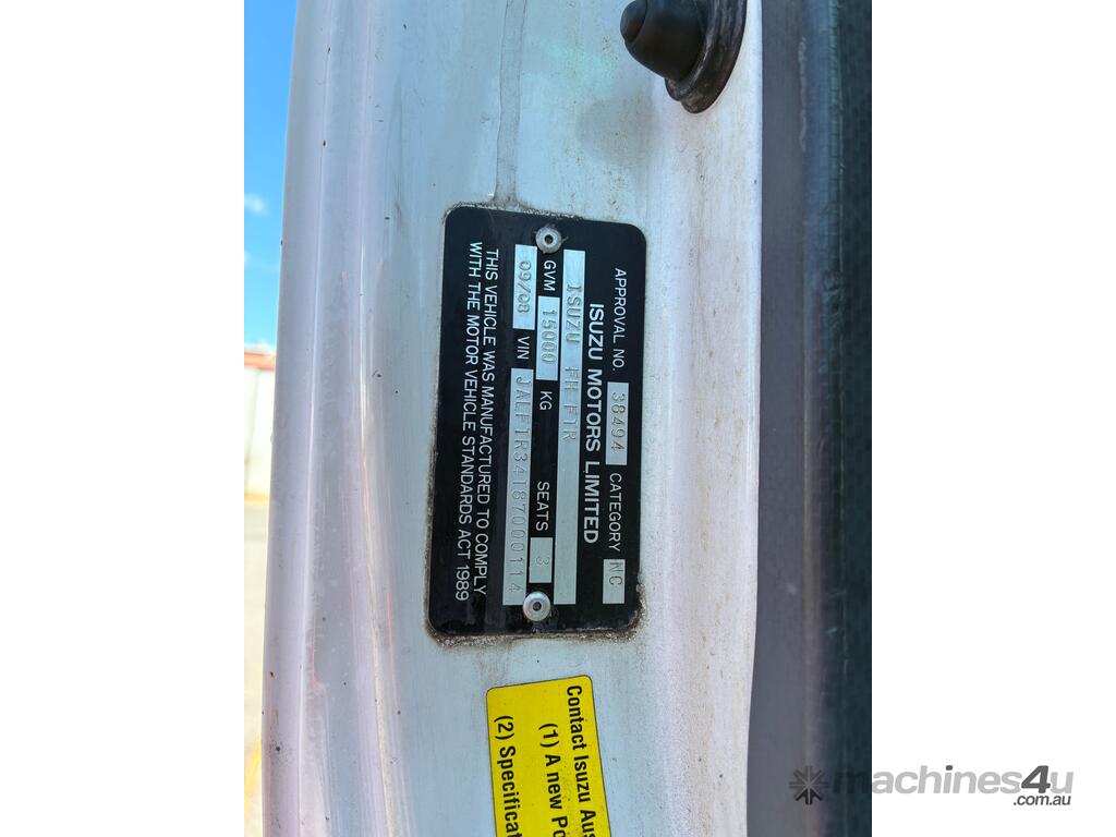CP: 09/2008,Isuzu,FTR900,Cab Chassis,Manual,Spring,6 Cyl,Diesel,6 Gears,718026 (Kms. Showing on Odometer),Hourmeter not visible,Colour: White,Rego. No: NP(AZ19PU), Unregistered,VIN: JALFTR34T87000114,Length: 8.6 M,GVM: 15000,GCM: 24000,Sold with No Plates