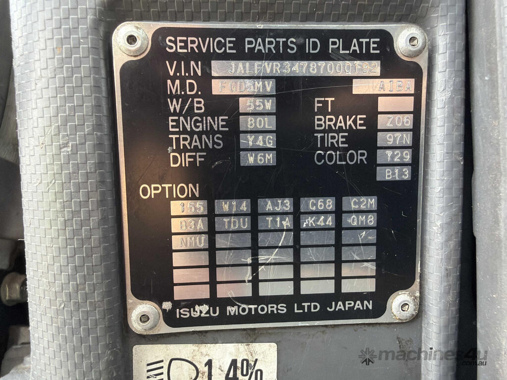 CP: 11/2008,Isuzu,FVD1000,EWP,Automatic,Airbags,Engine #: 6HK1477787,6 Cyl,Diesel Turbo,172035 (Kms. Showing on Odometer),16003 (Hrs. Showing on Hour meter),Rego. No: NP(XP64KD), Unregistered NSW,VIN: JALFVR2,Key No: 135E,Length: 9.5 m,GVM: 16000,GCM: 32000,Sold with No Plates,Key No: 135E