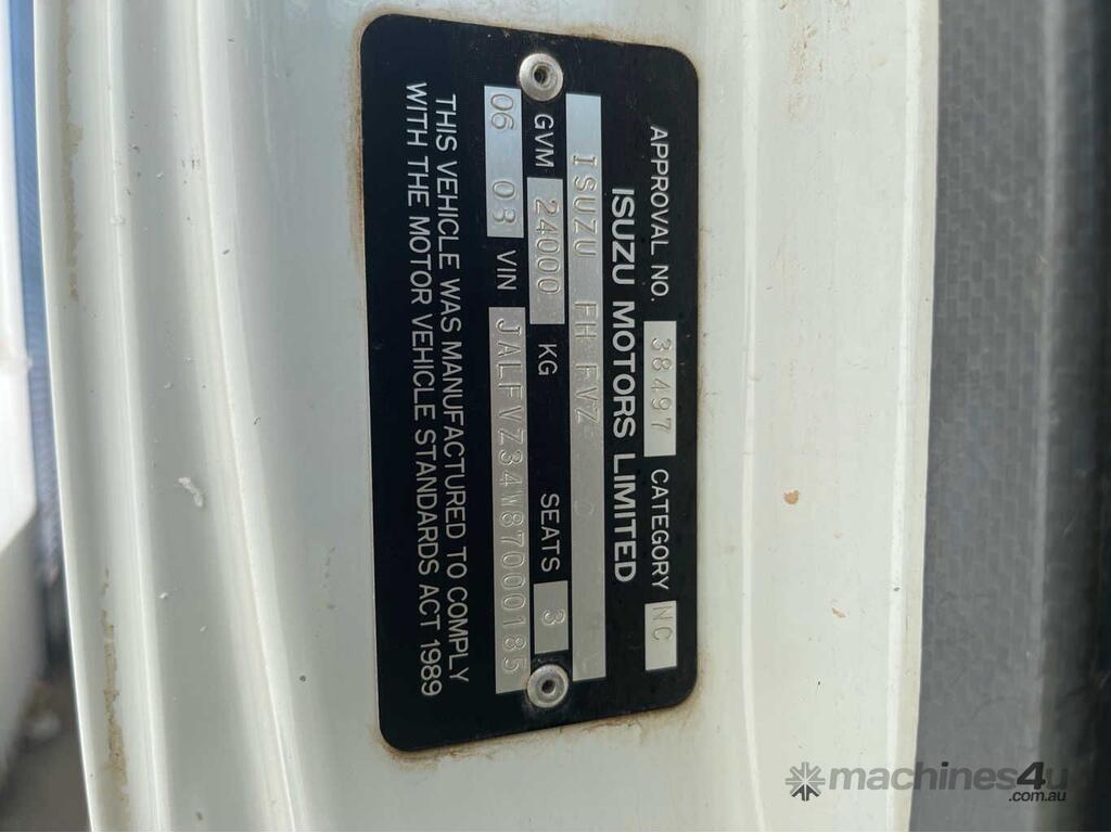 CP: 06/2008,Isuzu,FVZ 1400,EWP,Manual,Leaf Spring suspension,6 Cyl,Diesel Turbo,8 Gears,219259 (Kms. Showing on Odometer),6263 (Hrs. Showing on Hour meter),Colour: White,Rego. No: NP(XN76EN), Unregistered NSW,VIN: JALFVZ34W87000185,Length: 10 m,GVM: 24000,GCM: 36000,Sold with No Plates