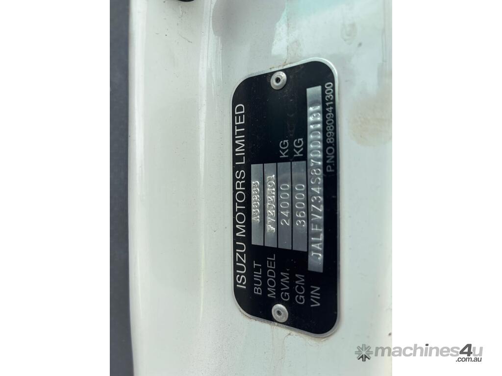 CP: 07/2008,Isuzu,FVZ,Flat Top,Automatic,Spring,Diesel,Turbo,132516 (Kms. Showing on Odometer),6512 (Hrs. Showing on Hour meter),Colour: White,Rego. No: NP(WPX444), Unregistered VIC,VIN: JALFVZ34S87000131,GVM: 24000,GCM: 36000,Sold with No Plates