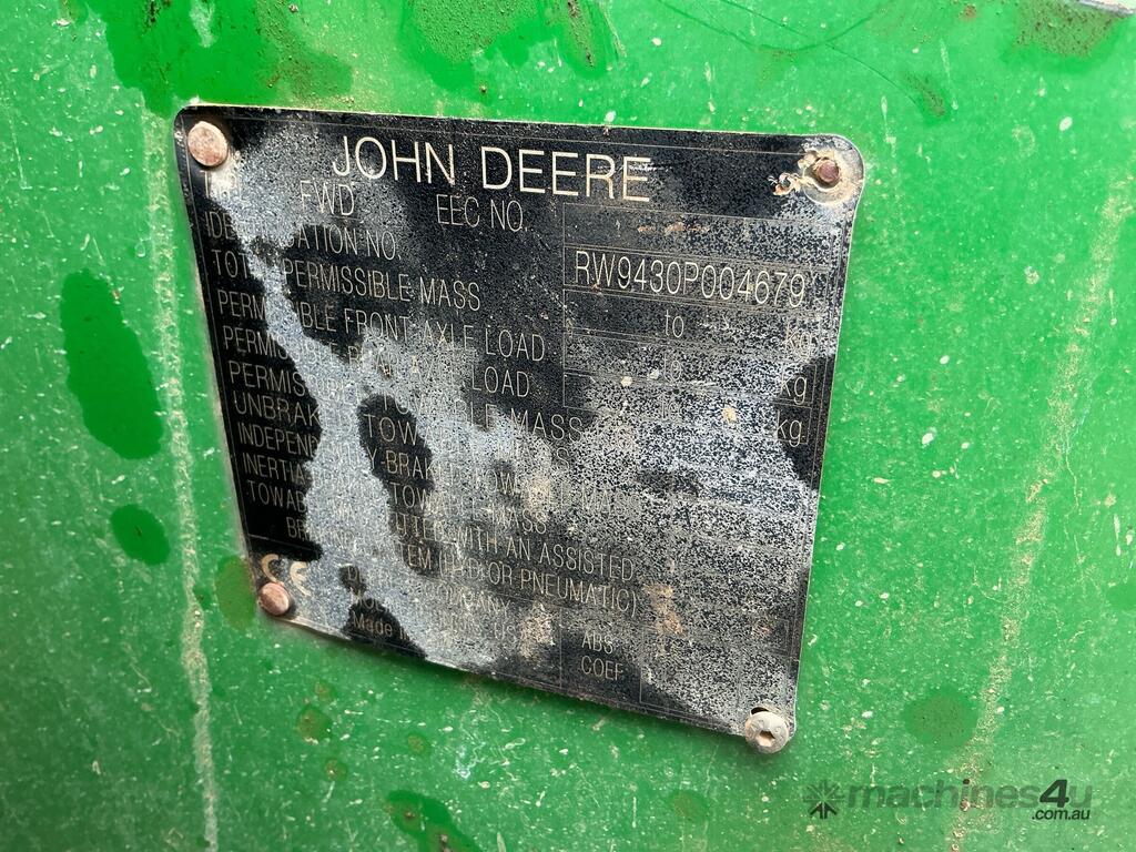 CP: CIRCA 2008,John Deere,9430T,4WD Tractor,Odometer not visible,12565 (Hrs. Showing on Hour meter),Colour: Green,Unregistered,Chassis: RW9430P004679,Serial No: RW9430P004679,Sold with No Plates,WOVR Status: WOVR N/A,Incident Type: Impact