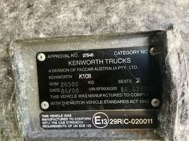 CP: 06/2008,Kenworth,K108,Prime Mover Sleeper Cab,Manual,Airbag Suspension,Cummins ISX,6 Cyl,Diesel,18 Gears,451251 (Kms. Showing on Odometer),Hourmeter not visible,Colour: White,Rego. No: NP(XW41HR), Unregistered,VIN: 6F50000008A438602,Key No: 372,GVM: 26500,GCM: 97000,Sold with No Plates,Key No: 372