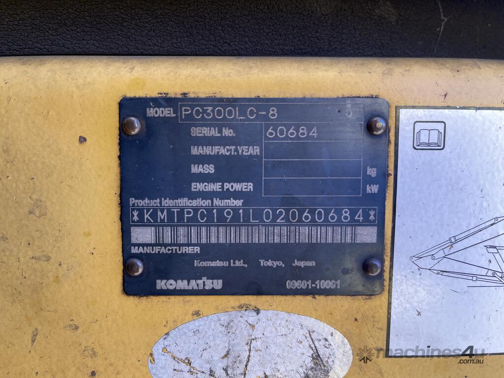 CP: CIRCA 2008,Komatsu,PC300LC-8,Excavator (Steel Tracked),6 Cyl,Diesel Turbo,Odometer not visible,13695 (Hrs. Showing on Hour meter),Unregistered,VIN: KMTPC191L02060684,Serial No: 60684,Sold with No Plates,Key No: M16