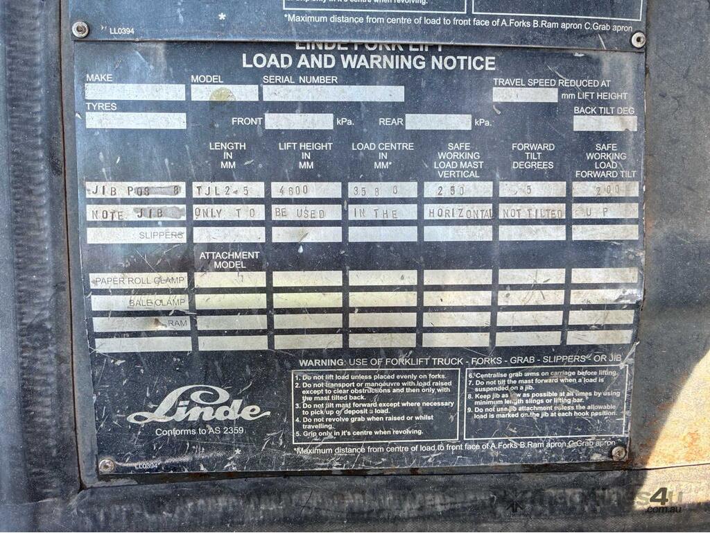 CP: CIRCA 2008,Built: 01/2008,Linde,H35T,Forklift,LPG only,Odometer not visible,25784 (Hrs. Showing on Hour meter),Colour: Red,Unregistered,Serial No: H2X393W05976,ROPS No: undefined,Sold with No Plates