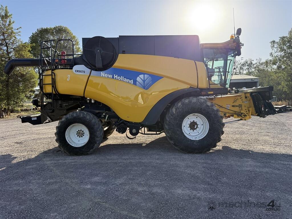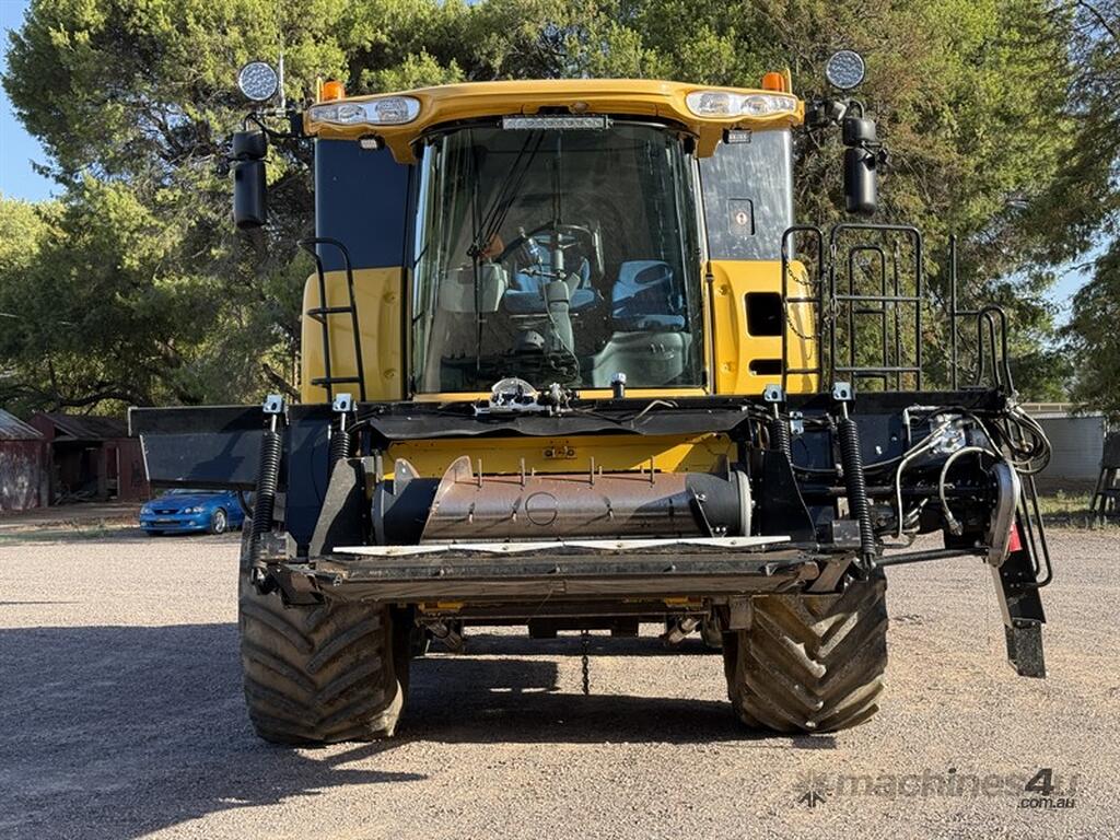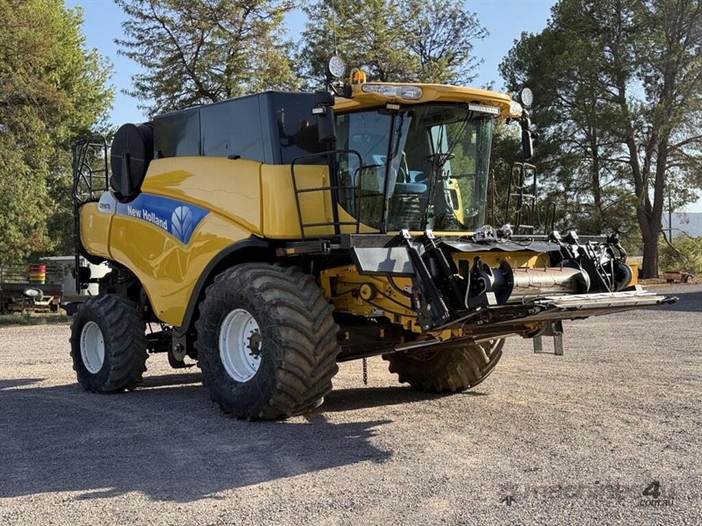 The 2008 New Holland CR9070 header has logged 4,546.59 engine hours and 3,488.17 rotor hours. It comes equipped with an upgraded lighting system and three flashing beacons. Three years ago, the rotor, sieves, and walkers were reconditioned, and both stub axles were replaced at that time. Additional features include a UHF radio, two fire extinguishers, and a bottom-filled auxiliary water tank. Please note that the E2-steer unit and auto steer will be removed before the sale, as guidance equipment is not incl