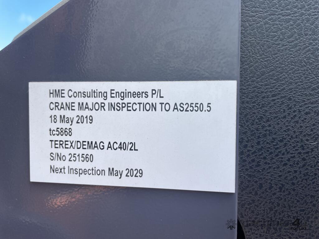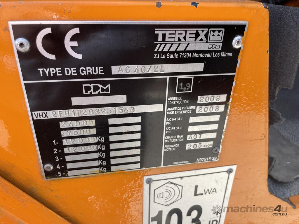 CP: CIRCA 2008,Terex,AC40 / 2L,All Terrain Crane,Diesel,98801 (Mls. Showing on Odometer),17321 (Hrs. Showing on Hour meter),Colour: Orange,Unregistered,Serial No: VHX2FH1R,Sold with No Plates