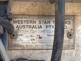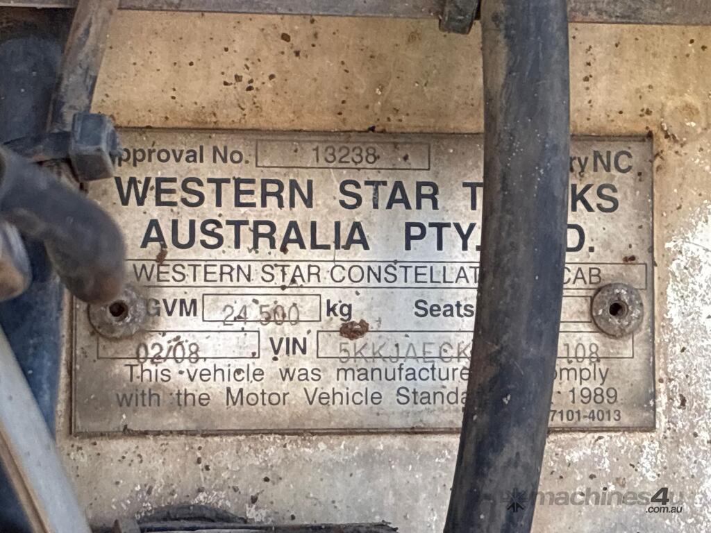 CP: 02/2008,Western Star,4800FX Constellation,Prime Mover Sleeper Cab,Manual,Airbag,6 Cyl,Diesel,Intercooler Turbo,18 Gears,980833 (Kms. Showing on Odometer),15108 (Hrs. Showing on Hour meter),Colour: White,Rego. No: NP(XB26DS), Unregistered NAT,VIN: 5KKJAECK18PZ69108,Key No: T55,Length: 7.43 m,GVM: 24500,GCM: 90500,Sold with No Plates,Key No: T55