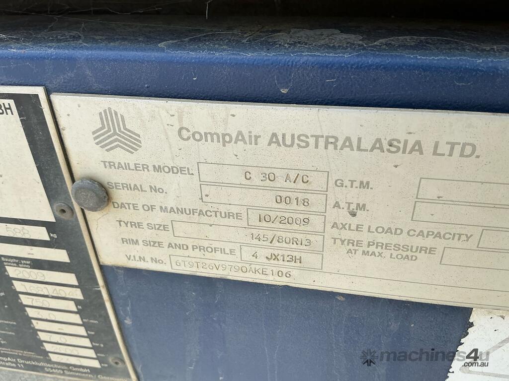 CP: 10/2009,Compair Australasia,C30,Air Compressor (Trailer Mounted),0 (undefined),Colour: Yellow,Unregistered,VIN: 6T9T26V9790AKE106,Serial No: 0018,Sold with No Plates