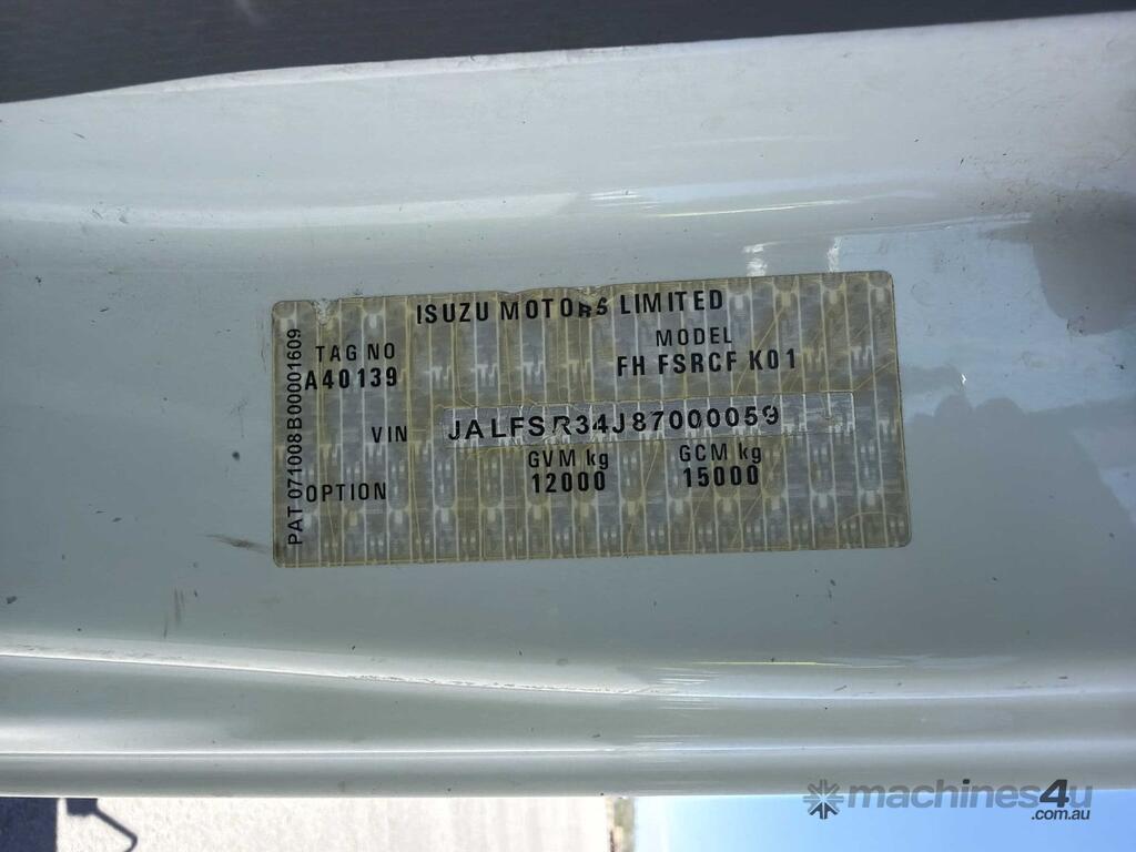 CP: 01/2009,Isuzu,FSR 700,EWP,Automatic,Spring,Engine #: 6HK1469423,Sitec Series III 235 HP,6 Cyl,Diesel Turbo,211042 (Kms. Showing on Odometer),4093 (Hrs. Showing on Hour meter),Colour: White,Rego. No: NP(XP74JX), Unregistered NSW,VIN: JALFSR34J87000059,Key No: 105E,Length: 8.1 m,GVM: 12000,GCM: 15000,Sold with No Plates,Key No: 105E