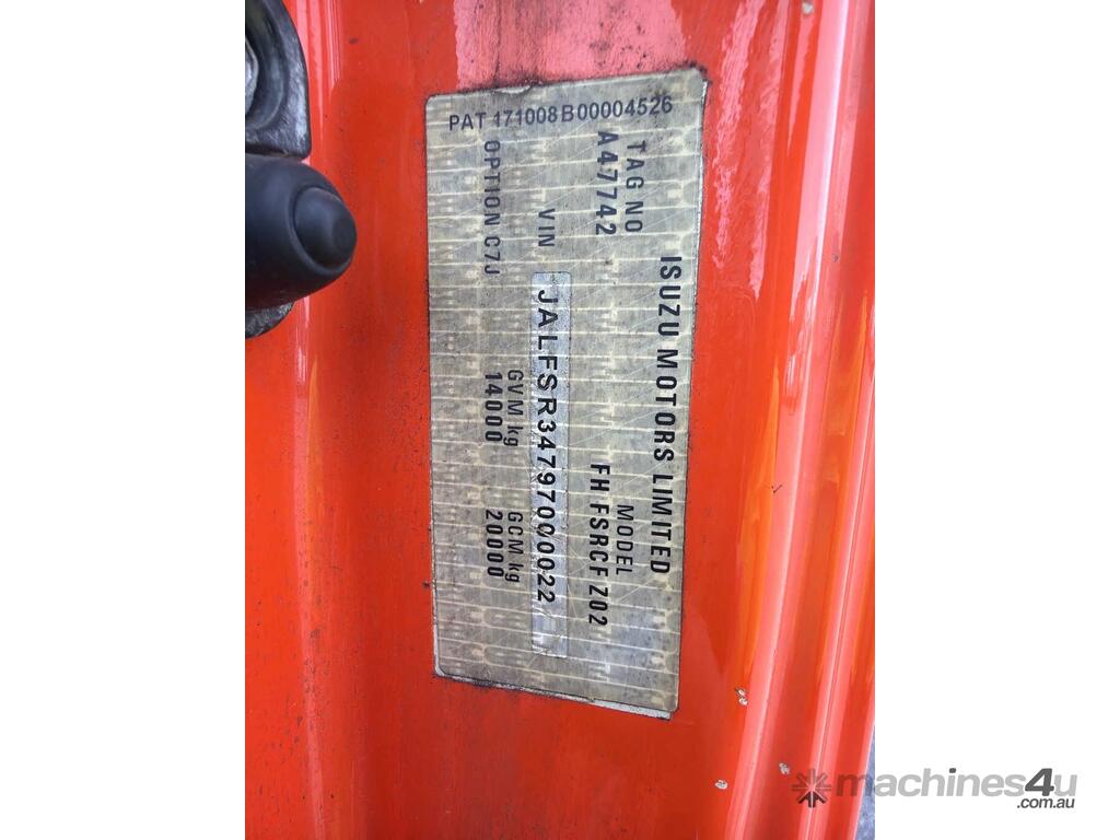 CP: 08/2009,Isuzu,FSR 850 Long,Curtainsider Day Cab,Automatic,Spring,Engine #: 6HK1484834,6 Cyl,Diesel Turbo,333347 (Kms. Showing on Odometer),20417 (Hrs. Showing on Hour meter),Colour: Orange,Rego. No: NP(XO66HA), Unregistered NSW,VIN: JALFSR2,Key No: 33S,Length: 10.1 m,GVM: 14000,GCM: 20000,Sold with No Plates,Key No: 33S