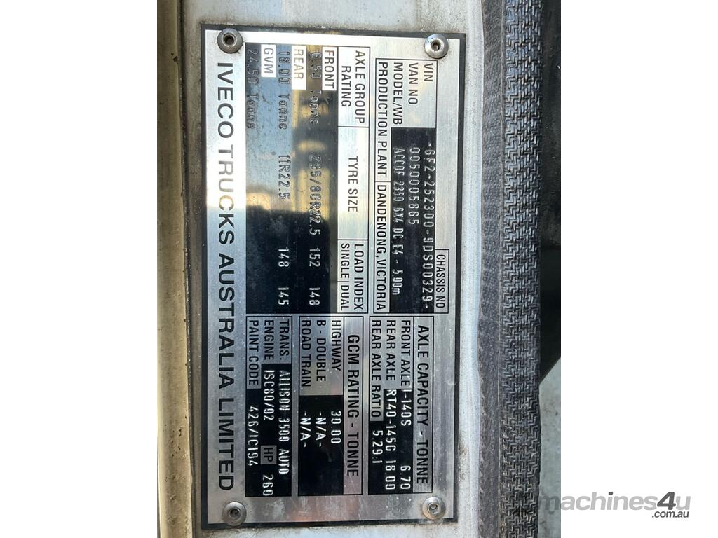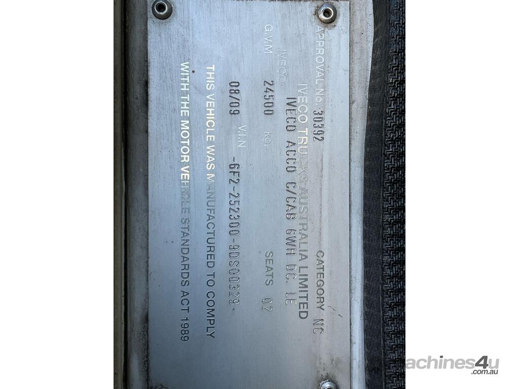 CP: 08/2009,Iveco,ACCO 2350,Cab Chassis,Automatic,Airbags,Cummins ISC,6 Cyl,Diesel Turbo,346315 (Kms. Showing on Odometer),Hourmeter not visible,Colour: White,Rego. No: NP(XN94RG), Unregistered NSW,VIN: 6F22523009DS00329,Key No: 60E,GVM: 24500,GCM: 30000,Sold with No Plates,Key No: 60E