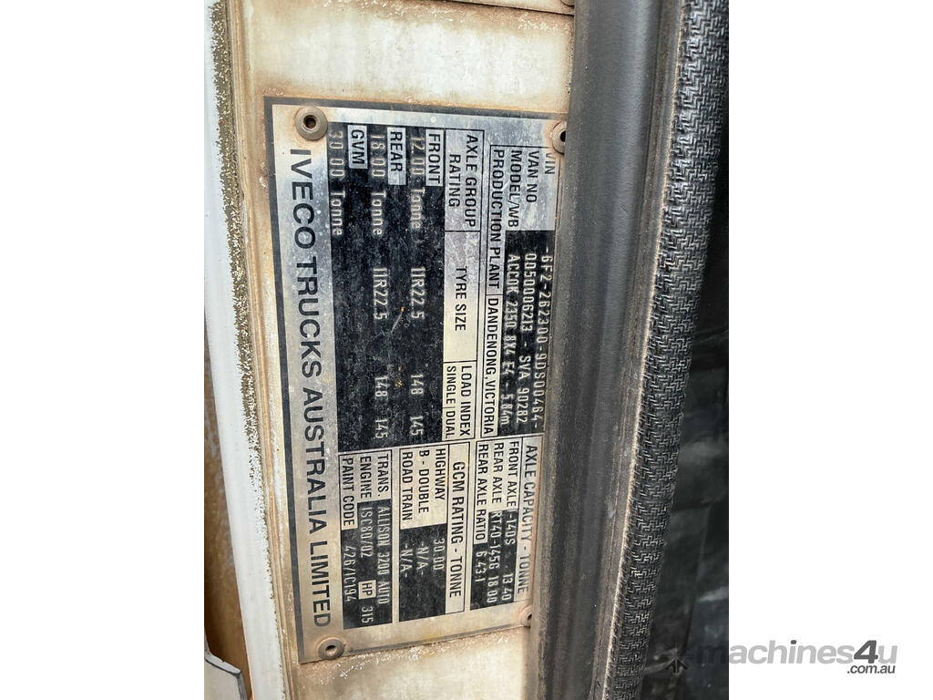 CP: 10/2009,Iveco,ACCO 2350,Cab Chassis,Automatic,Airbag Suspention ,Cummins ,6 Cyl,Diesel,371627 (Kms. Showing on Odometer),17915 (Hrs. Showing on Hour meter),Colour: White,Rego. No: 958128 NT,VIN: 6F22623009DS00464,Length: 9.3 undefined,GVM: 30000,GCM: 30000,Sold with No Plates