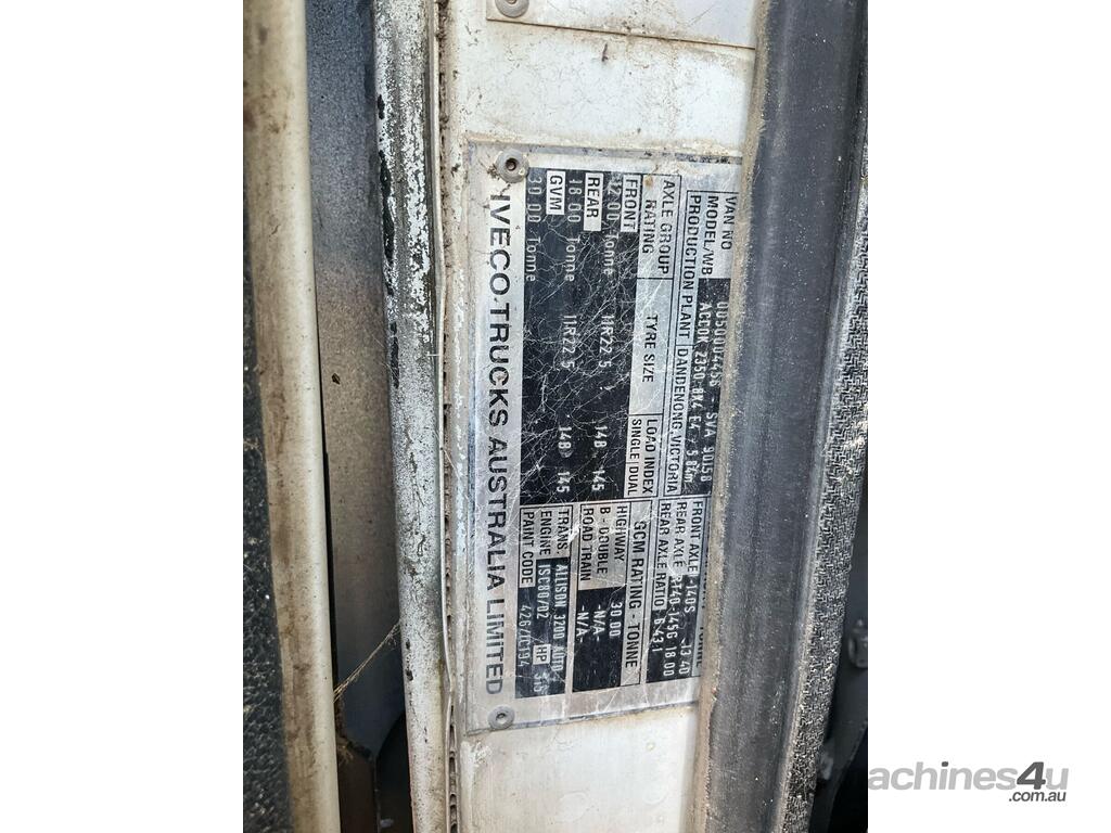CP: CIRCA 2009,Iveco,ACCO,Cab Chassis,Automatic,Airbag,Diesel,Turbo,419213 (Kms. Showing on Odometer),Hourmeter not visible,Colour: White,Unregistered,VIN: 6F22623009DS00239,GVM: 30000,Sold with No Plates,WOVR Status: WOVR N/A,Incident Type: Not Applicable
