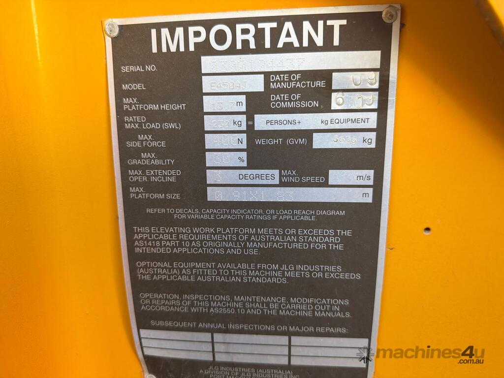 CP: CIRCA 2009,Built: 06/2009,JLG,E450AJ,Boom Lift (Electric),Battery,Odometer not visible,Hourmeter not visible,Colour: Yellow,Unregistered,Serial No: ,Sold with No Plates