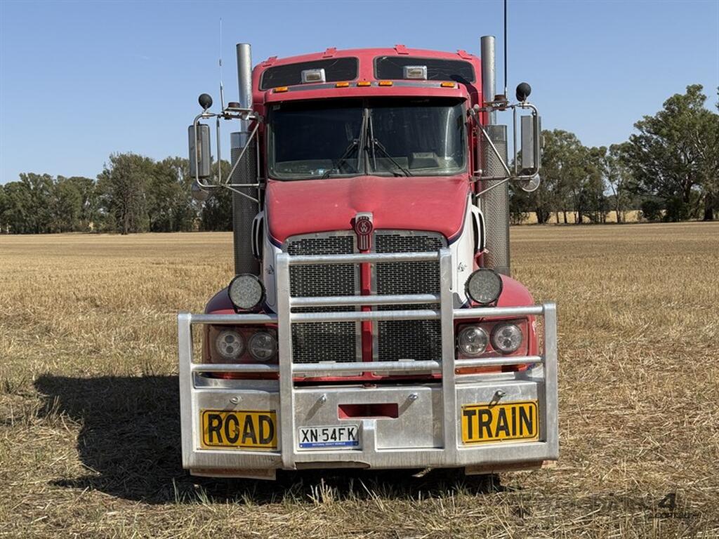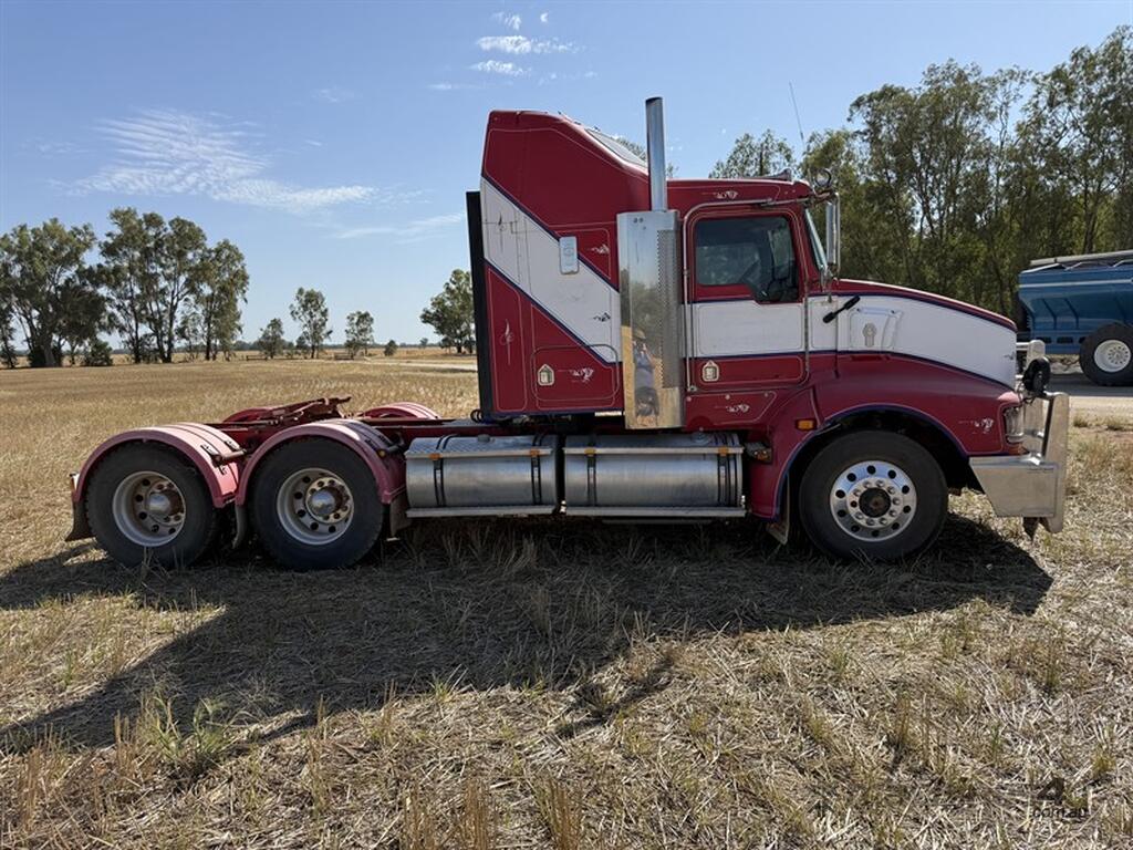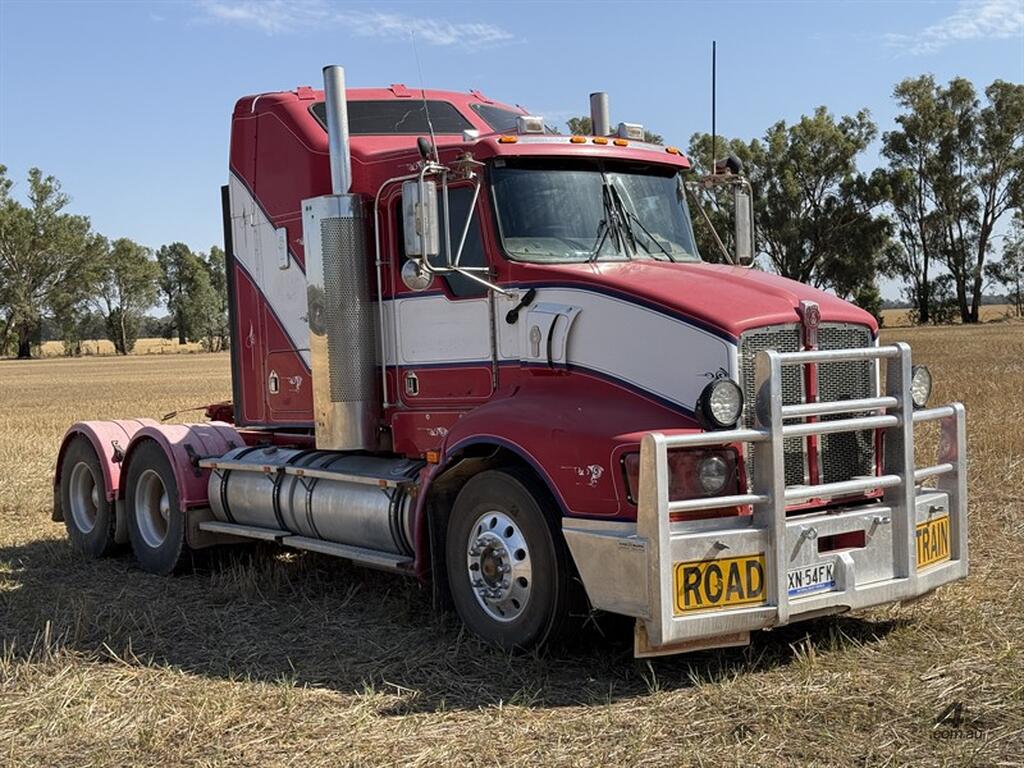 2009 Kenworth T408 VIN: 6F50000009A440991. Cummins ISX EGR motor, 18 speed Road Ranger and Meritor 46.60 diffs at 4.33 ratio, KW airbag suspension. Features PT0 and front hydraulics, Anderson plug, ABS and has new batteries fitted. GCM: 26500 kg, ATM 90t road train. King bullbar and driving lights, auto greaser, Viesa bunk cooler, Jost Teflon plate turntable, fire extinguisher, road train sign, two flashing beacons, and loading lights. Motor had rebuild 200k ago. One air cleaner clip has broken recently but