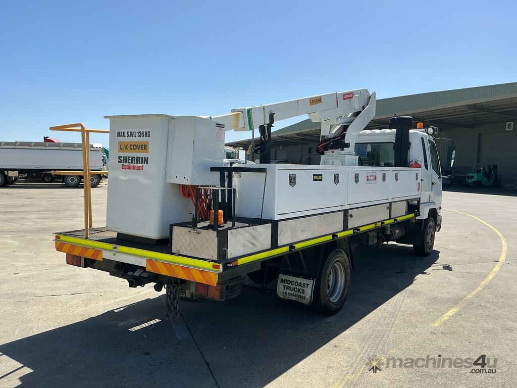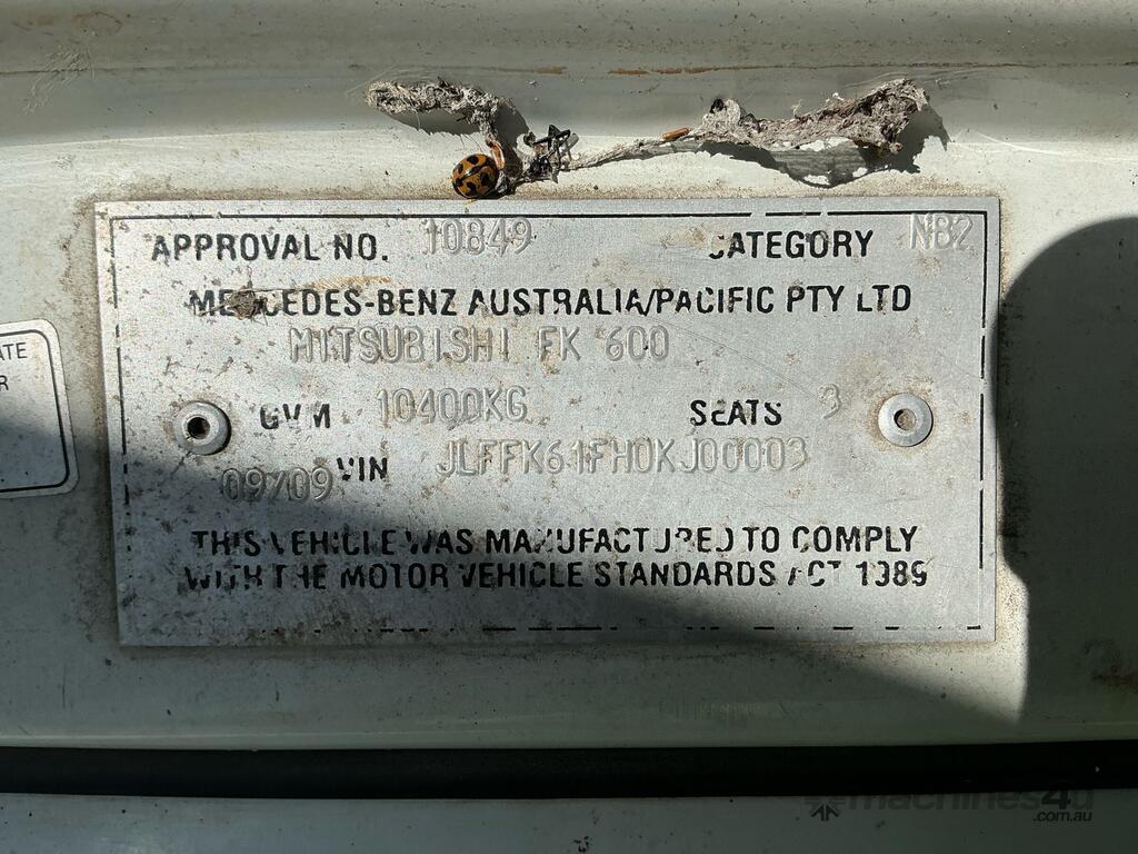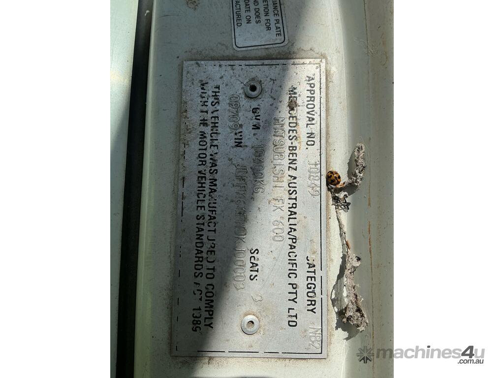 CP: 09/2009,Mitsubishi,Fighter FK600,EWP,Manual,Leaf Spring Suspension,Mitsubishi Fuso 6M60-3ATI,6 Cyl,Diesel,6 Gears,324776 (Kms. Showing on Odometer),Hourmeter not visible,Colour: White,Unregistered,VIN: JLFFK61FH0KJ00003,Key No: 209,Length: 7.4 m,GVM: 10400,GCM: 20000,Sold with No Plates,Key No: 209