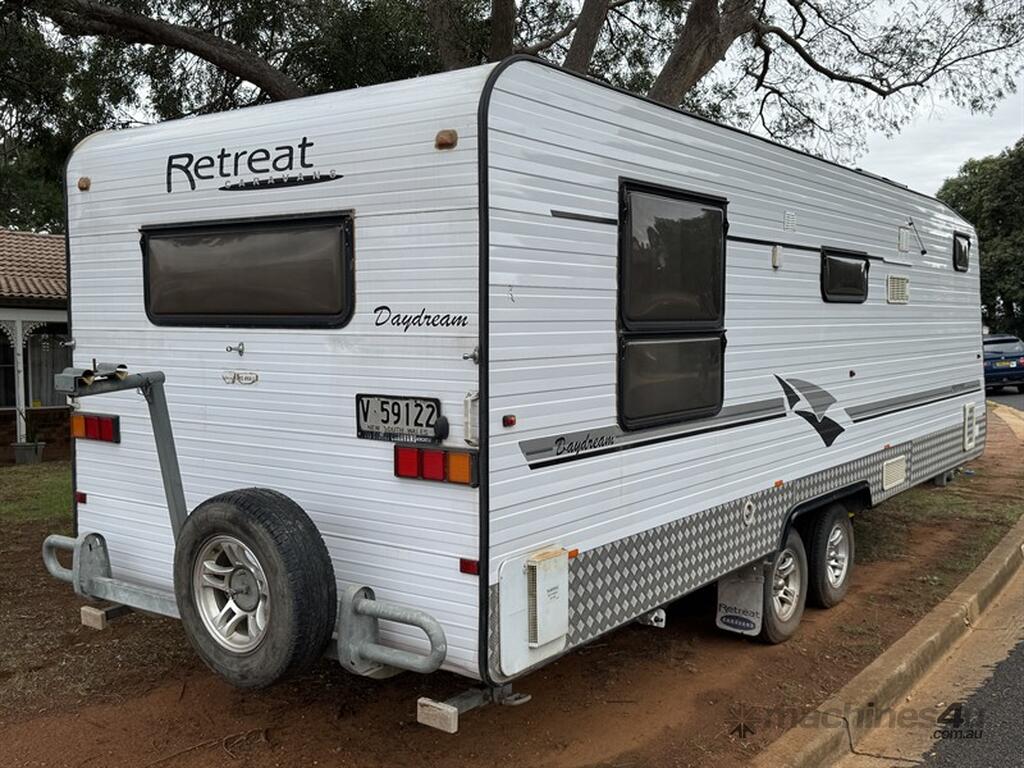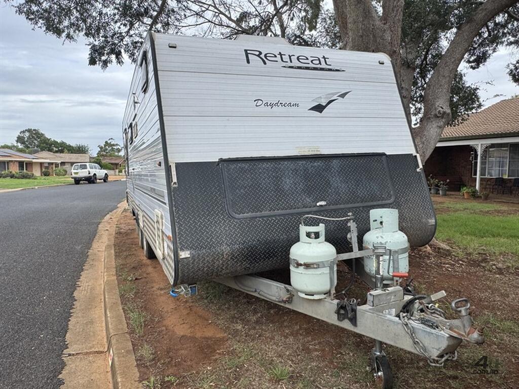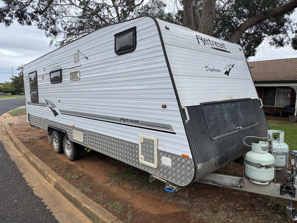 2009 23ft Retreat Daydream caravan. Dual axle with good tyres and original rims, electric brakes and weight distribution hitch included. Features, support legs, flipped suspension (better clearance), roof solar, and battery system running the fridge and lights. Microwave, fridge, TV, diesel heater, Dometic air conditioning, gas hot water with electric pump, cassette toilet, and bunk beds. Serviced September last year with new wheel bearings, brakes checked, and hot water system cleaned. Also includes bike