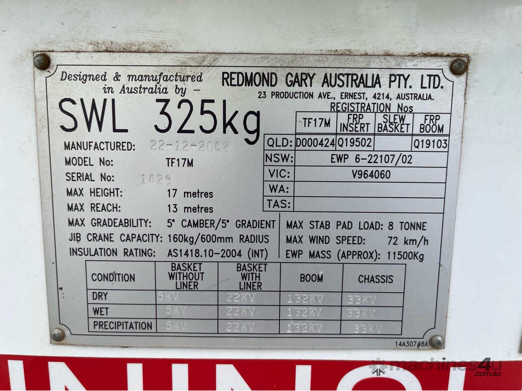 CP: 03/2009,Sterling,LT7500,EWP,Automatic,Leaf Spring Suspension ,Cummins ISC,6 Cyl,Diesel Turbo,6 Gears,182006 (Kms. Showing on Odometer),10078 (Hrs. Showing on Hour meter),Colour: White,Rego. No: NP(XN38QH), Unregistered NSW,VIN: 2FZHATBS49AAK6186,Length: 11 m,GVM: 24000,GCM: 28400,Sold with No Plates