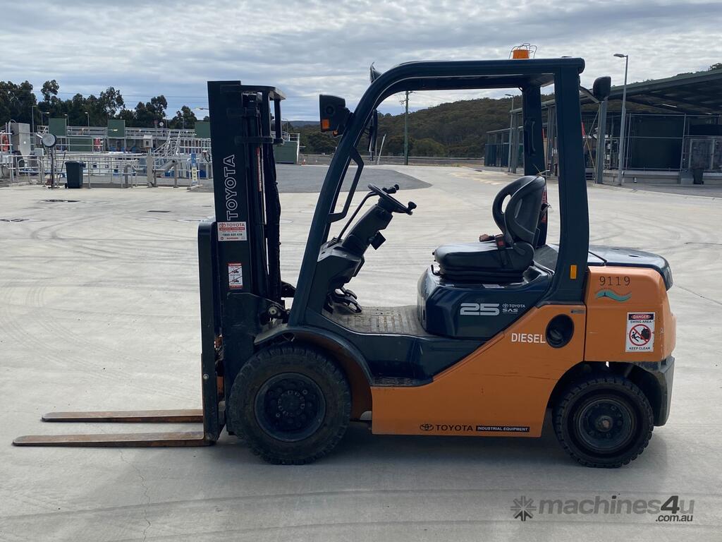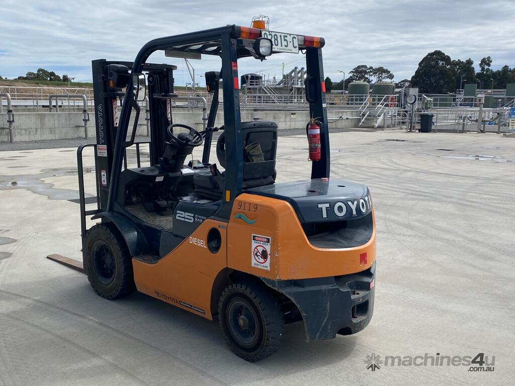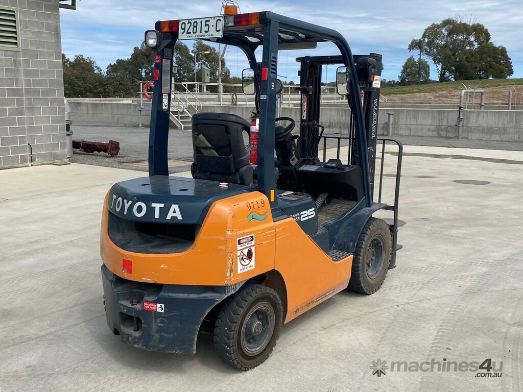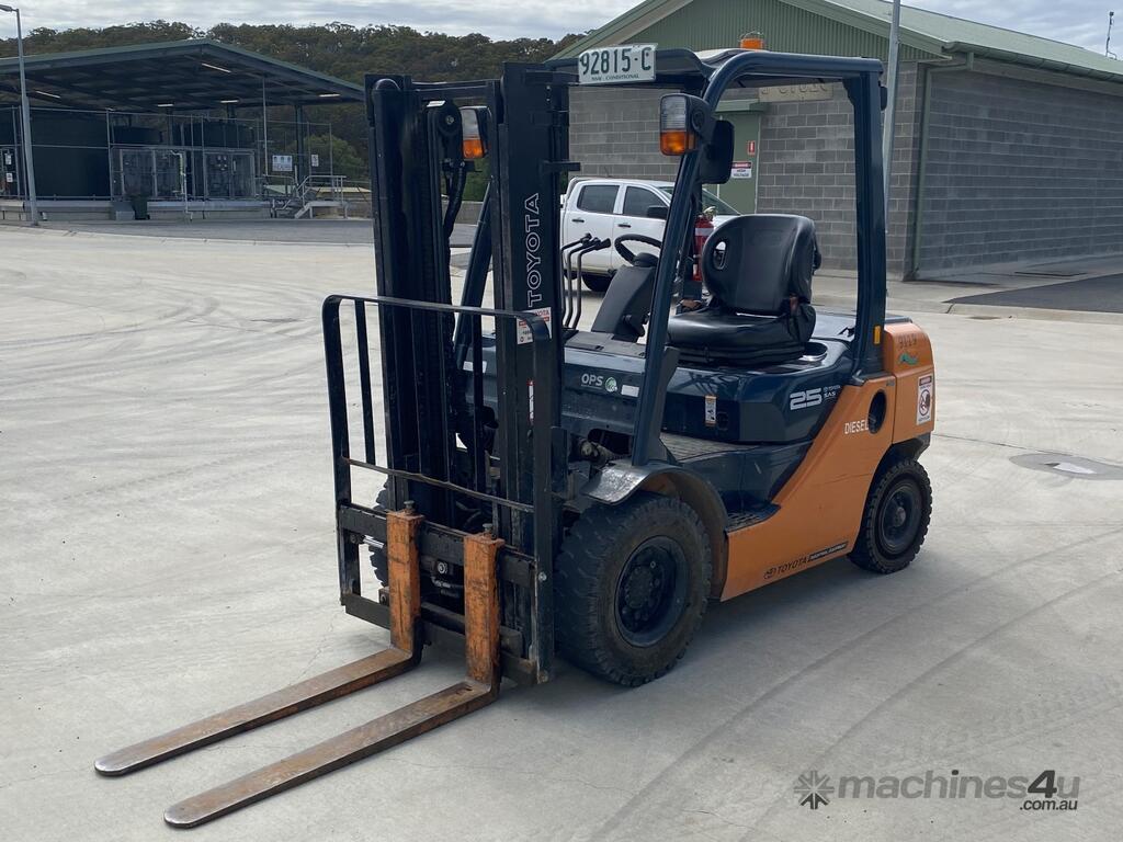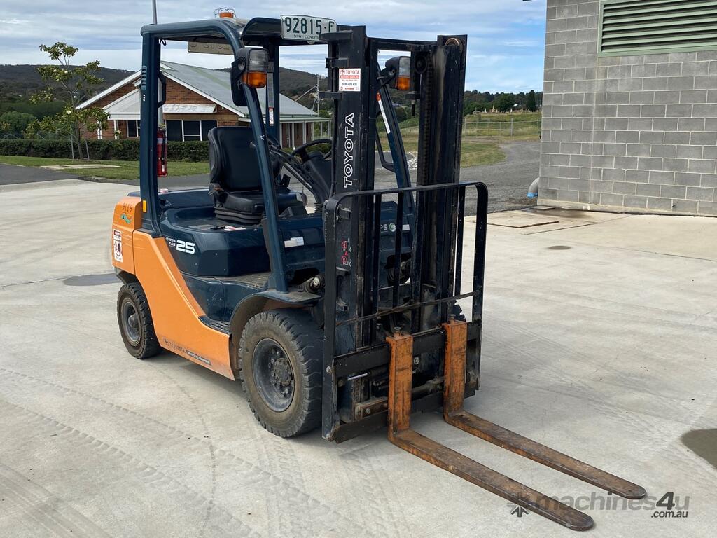 CP: CIRCA 2009,Toyota,62-8FD25,Forklift,4 Cyl,Diesel,Aspirated,Odometer not visible,1032 (Hrs. Showing on Hour meter),Colour: Orange,Rego. No: NP(92815C), Unregistered NSW,Serial No: 19791,Sold with No Plates