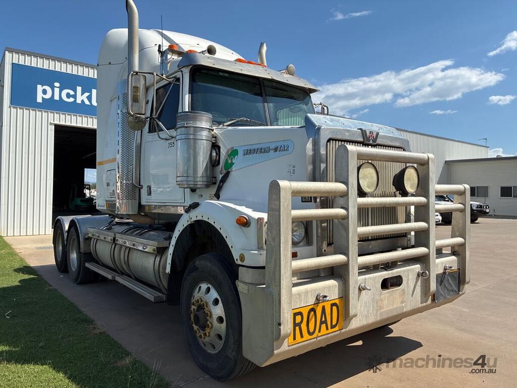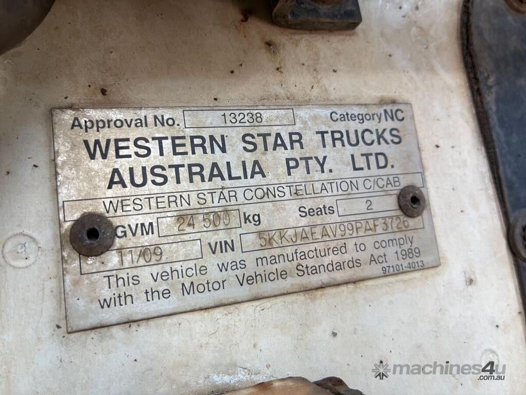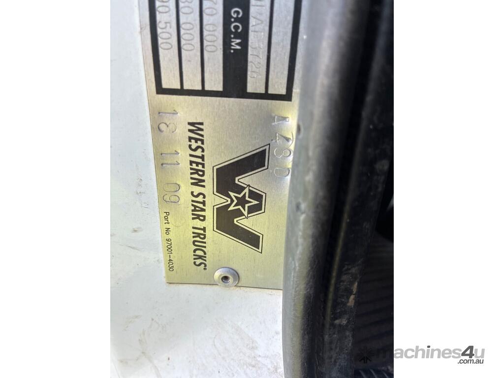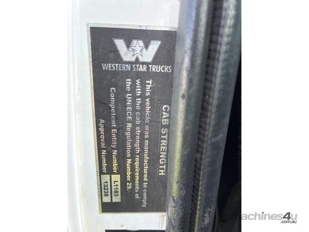 CP: 11/2009,Built: 11/2009,Western Star,4800FX,Prime Mover,Manual,Airbag Suspension ,Engine #: NXS32813,Caterpillar C15,15.2 Ltr,6 Cyl,Diesel,18 Gears,37677 (Kms. Showing on Odometer),8420 (Hrs. Showing on Hour meter),Colour: White,Rego. No: NP(570LTT), Unregistered QLD,VIN: 5KKJAEAV99PAF3726,Key No: T3,GVM: 24500,GCM: 106000,Sold with No Plates,Key No: T3
