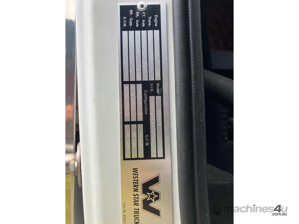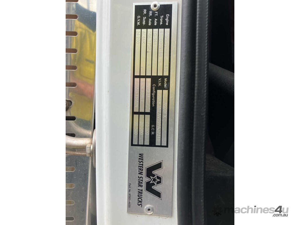CP: CIRCA 2009,Western Star,4964,Prime Mover,Manual,Airbag,6 Cyl,Diesel,Turbo,18 Gears,Odometer not visible,Hourmeter not visible,Colour: White,Rego. No: XB73LC,VIN: 5KKJAEAV09PAJ2311,Length: 8.3 m,GVM: 24200,GCM: 90500,Sold with No Plates,WOVR Status: WOVR N/A,Incident Type: Not Applicable