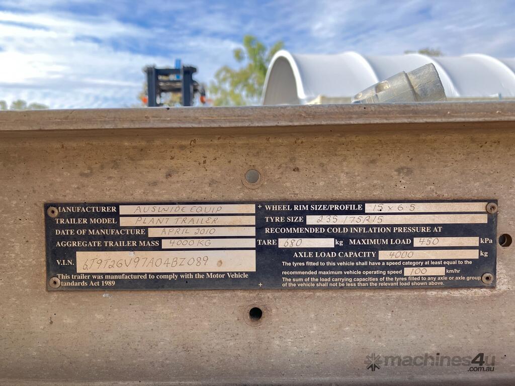 CP: 04/2010,Auswide Equipment,Plant Trailer,Tandem Axle Plant Trailer,Hubometer not visible,Colour: Silver,Rego. No: W36544 NSW,Rego expiry: 25/09/2026,VIN: 6T9T26V97A04BZ089,Sold with No Plates
