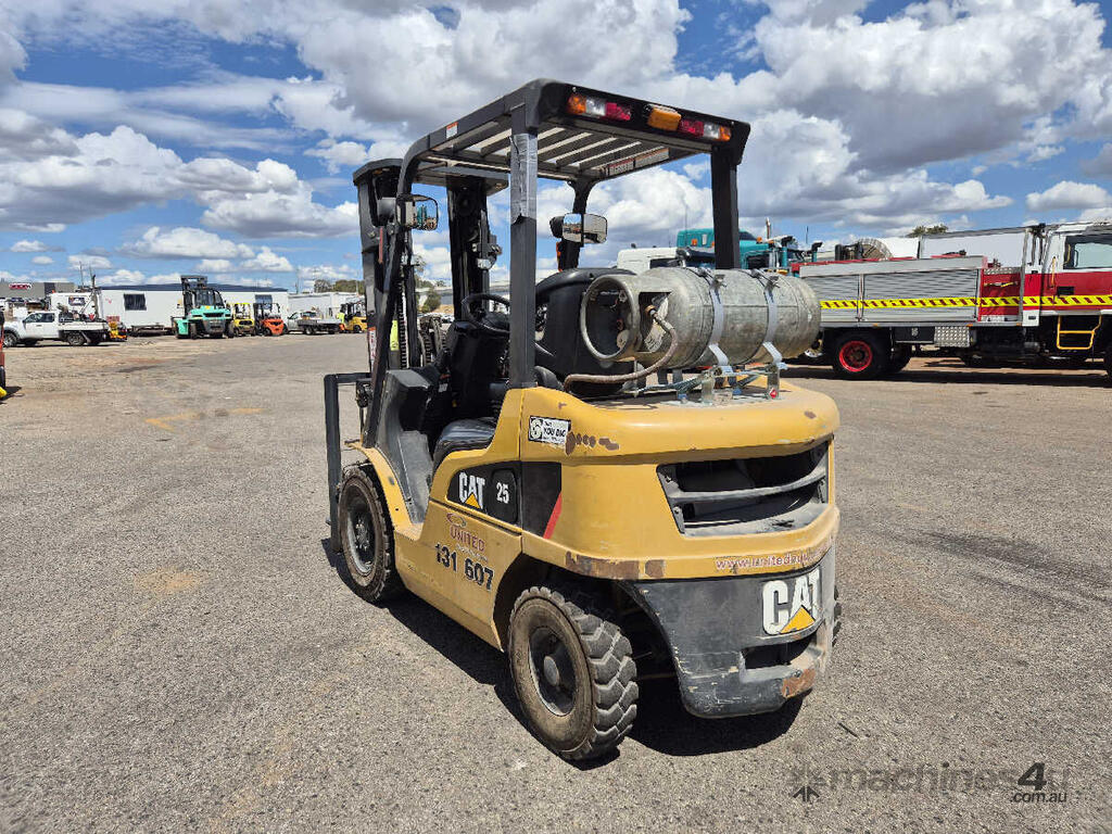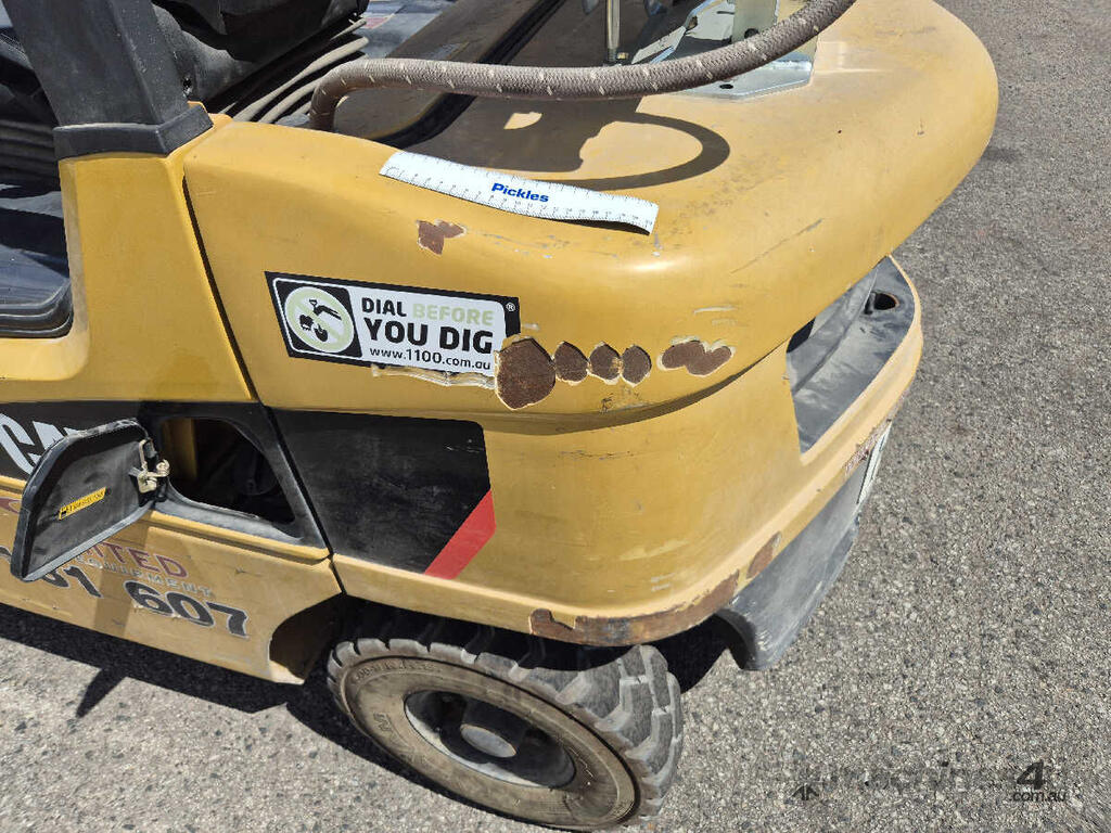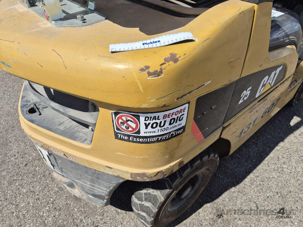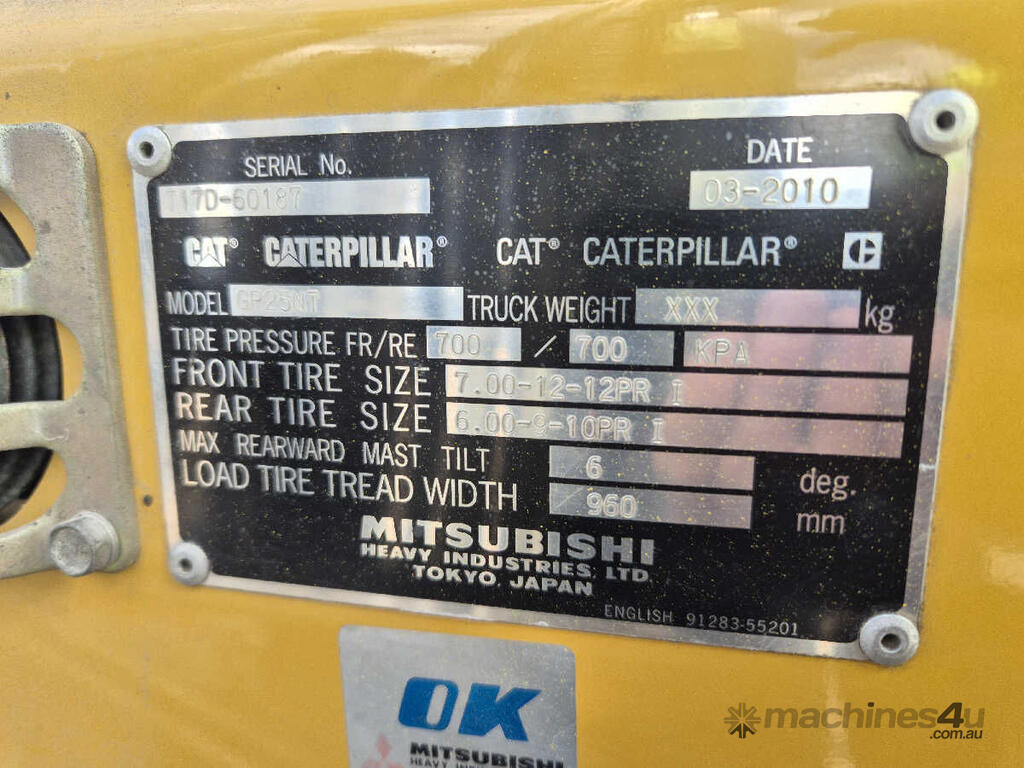 CP: CIRCA 2010,Built: 03/2010,Caterpillar,GP25NT,Forklift,4 Cyl,Petrol & LPG (Dual),Odometer not visible,2069 (Hrs. Showing on Hour meter),Colour: Yellow,Unregistered,Serial No: T17D60187,Sold with No Plates,Key No: 298