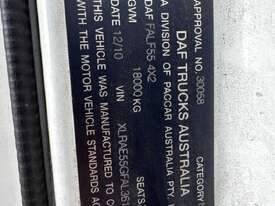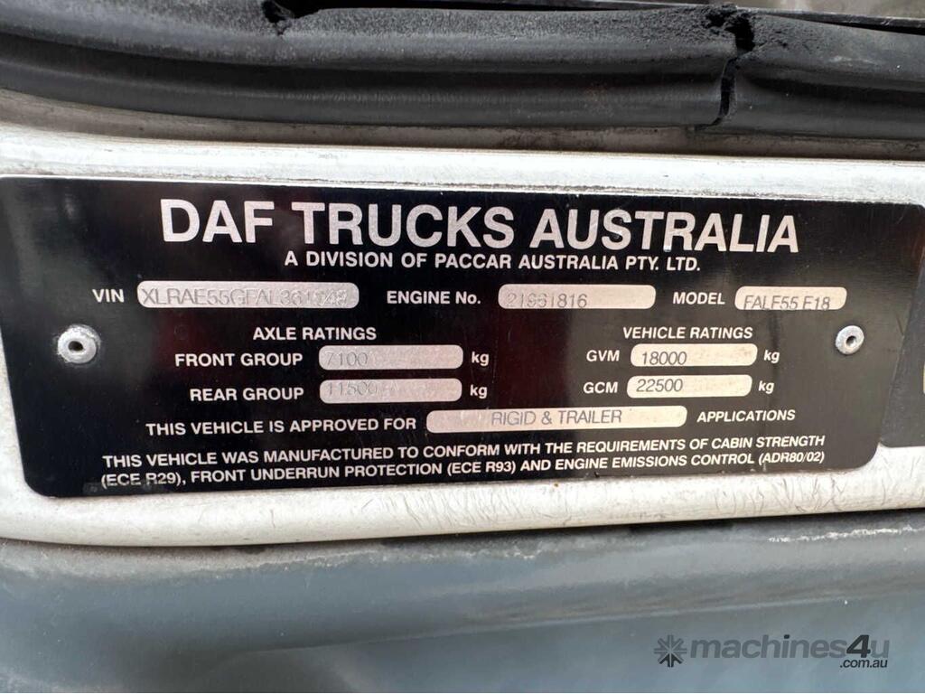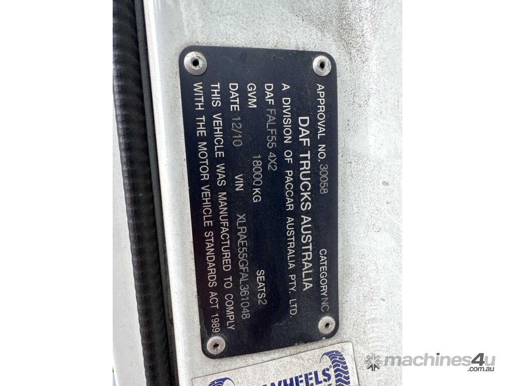 CP: 12/2010,DAF,FALF55,Curtainsider,Automatic,Airbag,6 Cyl,Diesel,573981 (Kms. Showing on Odometer),Hourmeter not visible,Colour: White,Unregistered,VIN: XLRAE55GFAL361048,GVM: 18000,GCM: 22500,Sold with No Plates,WOVR Status: WOVR N/A,Incident Type: Not Applicable