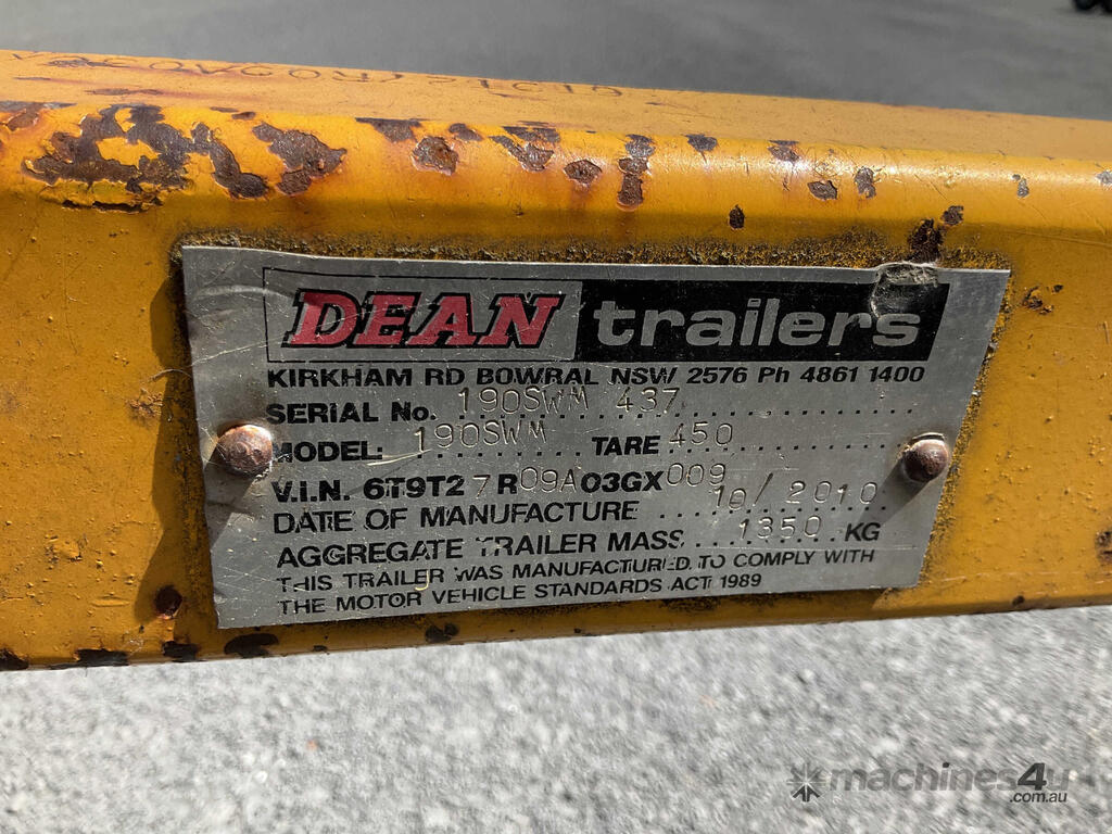 CP: 10/2010,Built: 10/2010,Dean Trailers,190SWM,Single Axle Plant Trailer,Hubometer not visible,Colour: Yellow,Rego. No: W69611 NSW,Rego expiry: 05/12/2026,VIN: 6T9T27R09A03GX009,Serial No: NULL,Sold with No Plates