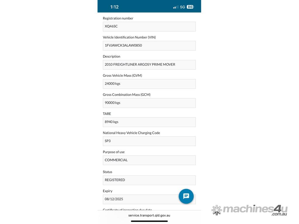 CP: CIRCA 2010,Freightliner,Argosy,Prime Mover XXL Sleeper Cab,Manual,Airbag Suspension,Diesel,Odometer not visible,Hourmeter not visible,Colour: White,Rego. No: NP(XQ46SC), Unregistered QLD,VIN: 1FVJAWCK3ALAW0850,Sold with No Plates,WOVR Status: WOVR N/A,Incident Type: Impact