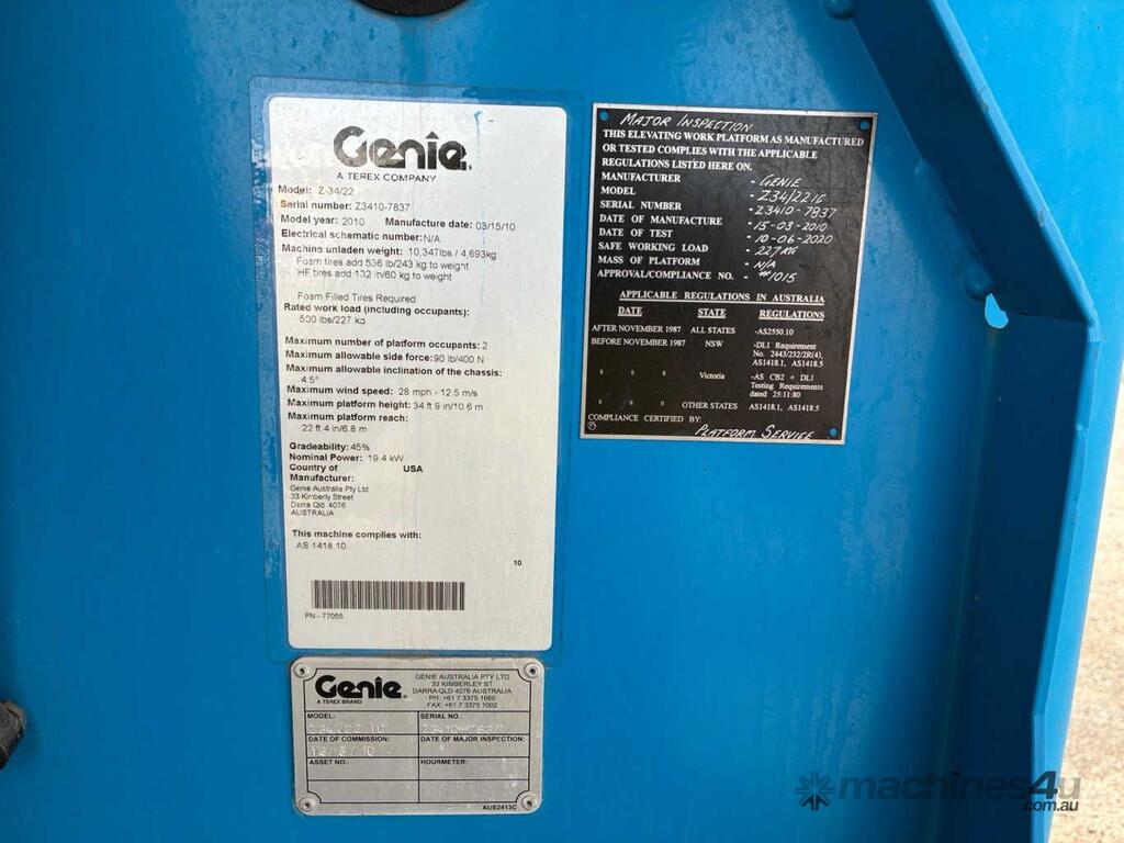 CP: 03/2010,Genie,Z34/221c,Boom Lift,4 Cyl,Diesel,Odometer not visible,4085 (Hrs. Showing on Hour meter),Colour: Blue,Unregistered,Serial No: Z3410-7837,Sold with No Plates,Key No: 32