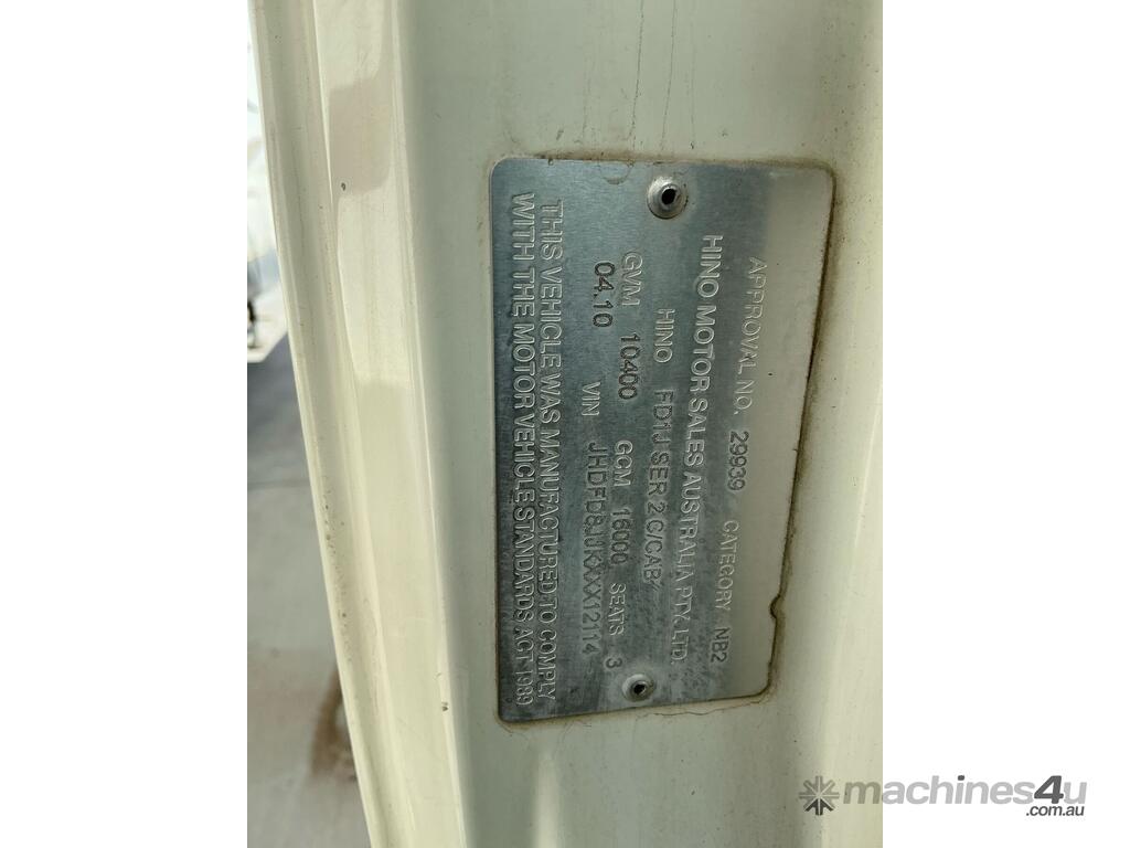 CP: 04/2010,Hino,FD 500,Crane Truck,Manual,Diesel,Odometer not visible,Hourmeter not visible,Colour: White,Rego. No: NP(XN63SW), Unregistered NAT,VIN: JHDFD8JJKXXX12114,Length: 25 undefined,GVM: 10400,GCM: 16000,Sold with No Plates,WOVR Status: WOVR N/A,Incident Type: Impact