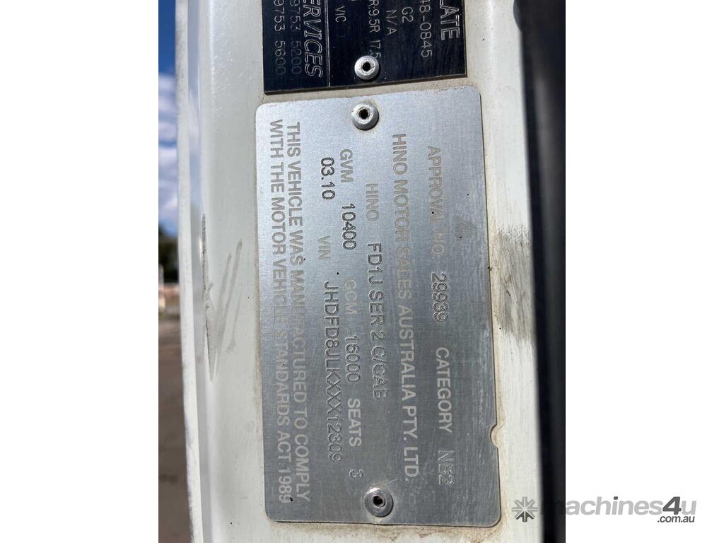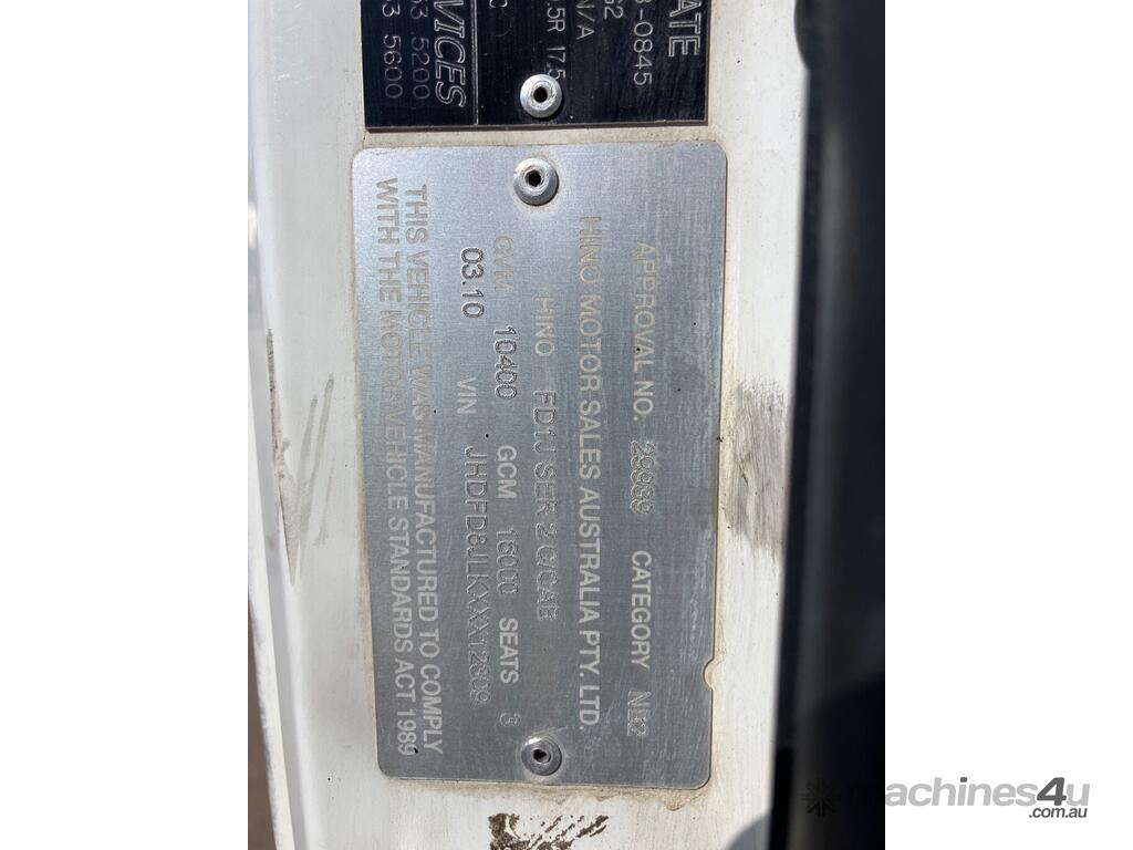 CP: 03/2010,Hino,FD,Table Top,Manual,Airbag Suspension ,Nissan Diesel,6 Cyl,Diesel,Odometer not visible,Hourmeter not visible,Colour: White,Rego. No: NP(XP65CG), Unregistered NAT,VIN: JHDFD8JLKXXX12309,Length: 8.4 m,GVM: 10400,GCM: 16000,Sold with No Plates,WOVR Status: WOVR N/A,Incident Type: Impact