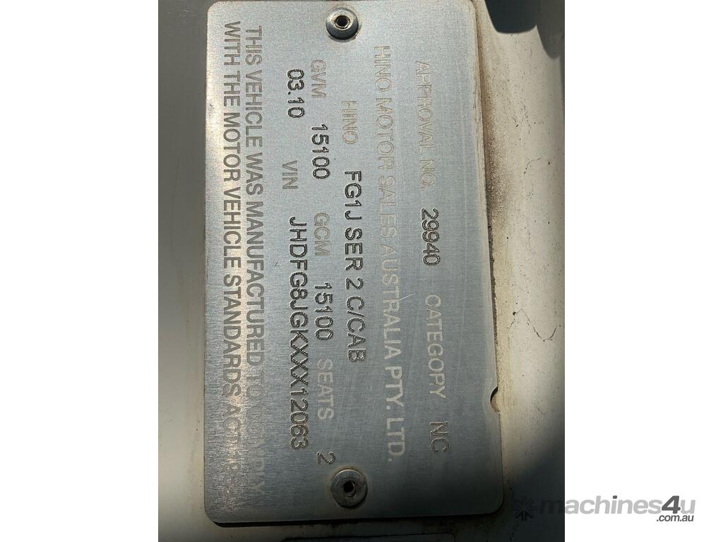 CP: 03/2010,Hino,FG1J,Dual Control Road Sweeper,Automatic,Spring,6 Cyl,Diesel Turbo,346953 (Kms. Showing on Odometer),Hourmeter not visible,Colour: White,Rego. No: XN56DQ NSW,Rego expiry: 21/11/2025,VIN: JHDFG8JGKXXX12063,Key No: 423E,Length: 6.4 m,GVM: 15100,GCM: 15100,Sold with No Plates,Key No: 423E
