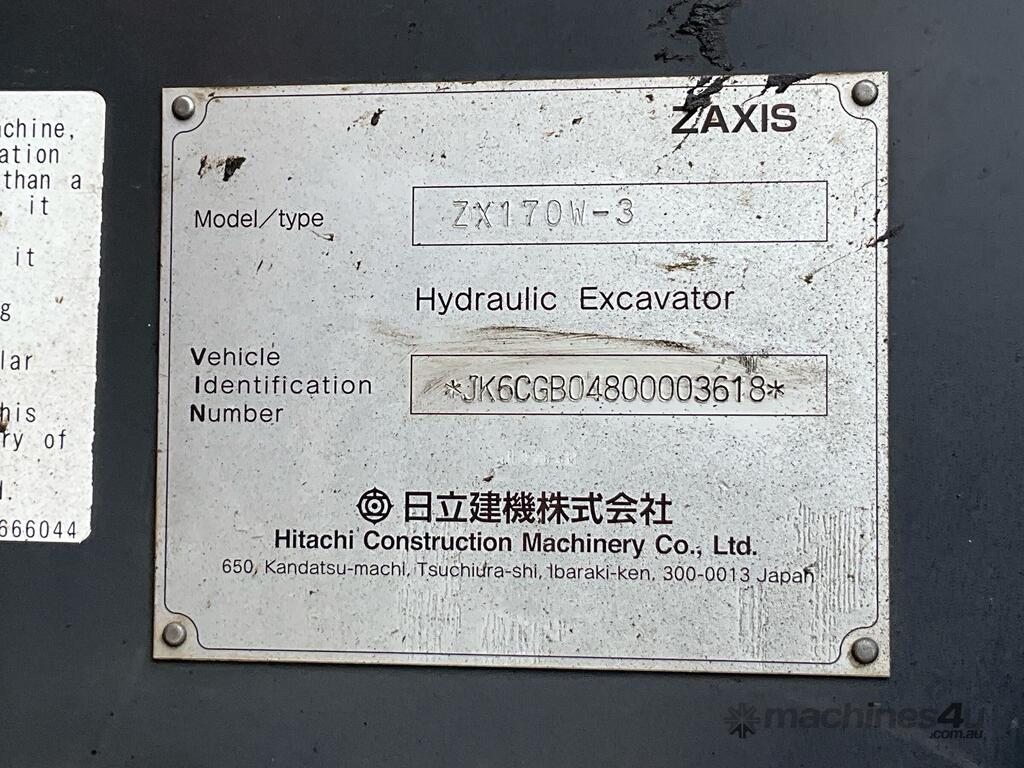 CP: CIRCA 2010,Hitachi,ZX170W-3,Excavator (Wheeled),4 Cyl,Diesel,Odometer not visible,10697 (Hrs. Showing on Hour meter),Colour: Orange,Unregistered,Serial No: JK6CGB8,Sold with No Plates,Key No: 123
