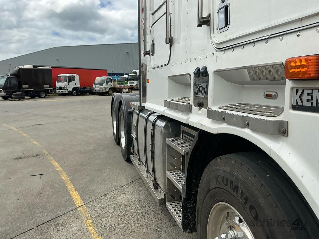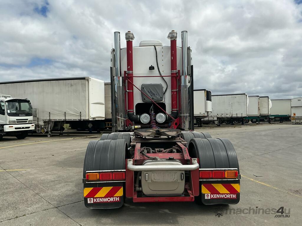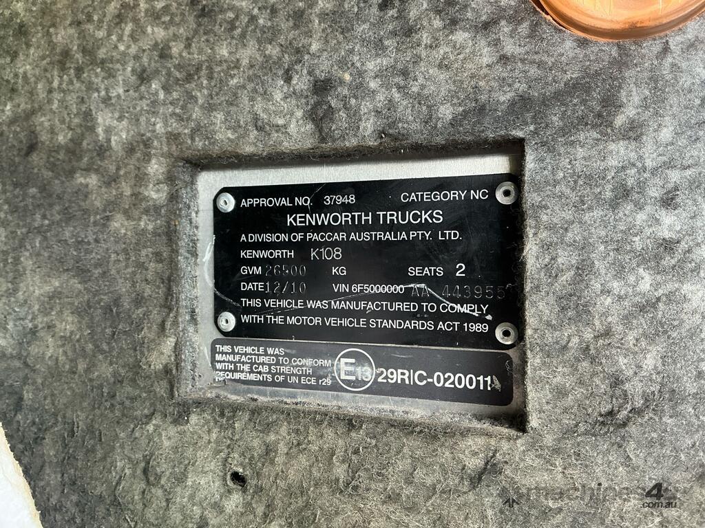 CP: 12/2010,Kenworth,K108 Big Cab,Prime Mover Sleeper Cab,Manual,Airbag Suspension,Cummins,6 Cyl,Diesel,18 Gears,857873 (Kms. Showing on Odometer),34965 (Hrs. Showing on Hour meter),Colour: White,Rego. No: NP(XW91SX), Unregistered VIC,VIN: 6F5000000AA443955,Key No: 126,GVM: 26500,GCM: 97000,Sold with No Plates,Key No: 126