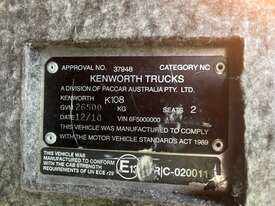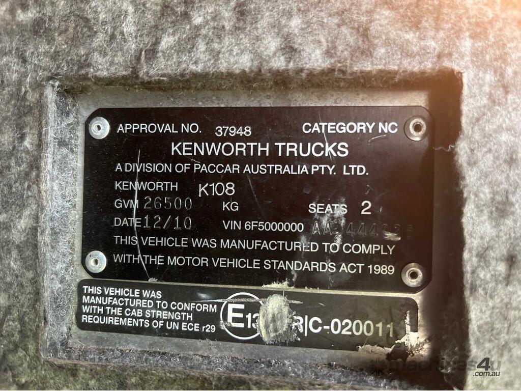 CP: 12/2010,Kenworth,K108,Prime Mover,Manual,Airbag,Cummins,6 Cyl,Diesel,18 Gears,567754 (Kms. Showing on Odometer),Hourmeter not visible,Colour: Grey,Rego. No: XB32ER QLD,VIN: 6F5000000AA444026,Key No: 25,GVM: 26500,GCM: 97000,Sold with No Plates,Key No: 25