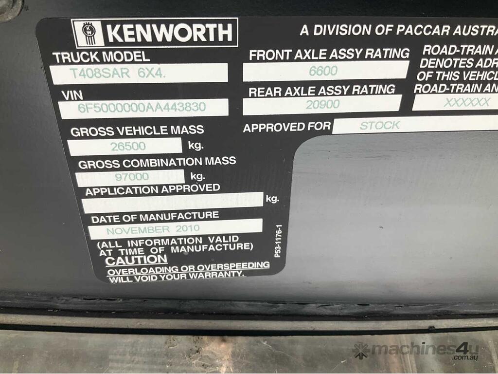 CP: 11/2010,Kenworth,T408SAR,Prime Mover Sleeper Cab,Manual,Airbags ,Engine #: 79436175,Cummins ISX,6 Cyl,Diesel Turbo,18 Gears,360040 (Kms. Showing on Odometer),Hourmeter not visible,Colour: White,Rego. No: NP(XN92PR), Unregistered NSW,VIN: 6F5000000AA443830,Key No: 485S,Length: 7.5 m,GVM: 26500,GCM: 97000,Sold with No Plates,Key No: 485S