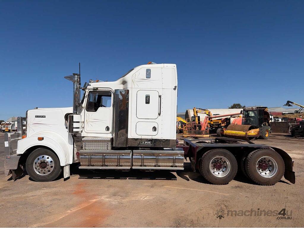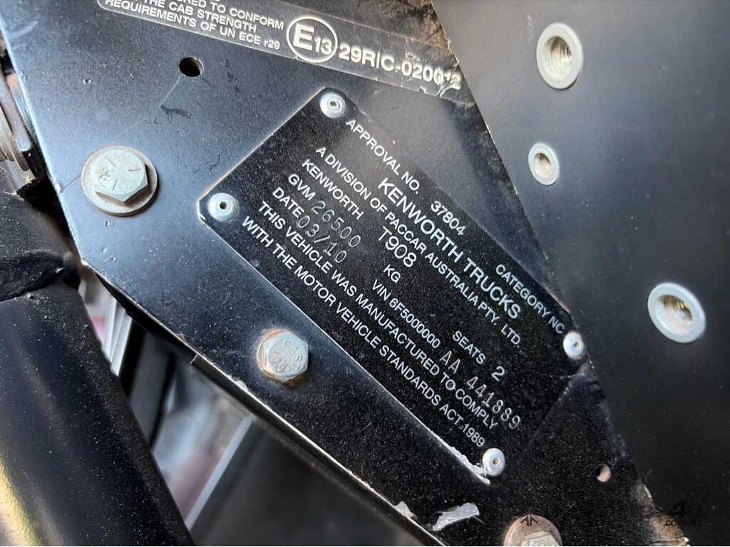 CP: 03/2010,Kenworth,T908,Prime Mover Sleeper Cab,Manual,Airbag,Cummins,6 Cyl,Diesel Turbo,18 Gears,556859 (Kms. Showing on Odometer),Hourmeter not visible,Colour: White,Rego. No: NP(TUF908), Unregistered WA,VIN: 6F5000000AA441889,Length: 8.7 m,GVM: 26500,GCM: 97000,Sold with No Plates,WOVR Status: WOVR N/A,Incident Type: Impact