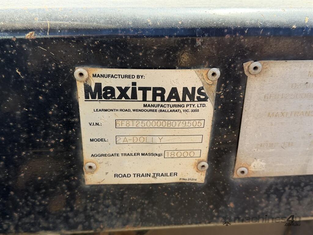 2010 MAXITRANS TANDEM AXLE DOLLY, VIN: 6F8T250000B079505, NO REGISTRATION, NO COI. LOCATION: HALFERTY STREET, EMERALD, QLD 4720. INSPECTIONS & COLLECTIONS: MONDAY TO FRIDAY, 8AM TO 4PM. ENQUIRIES: CAMERON BENSLEY ON OR CAMERONEMERALDAUCTIONCENTRE