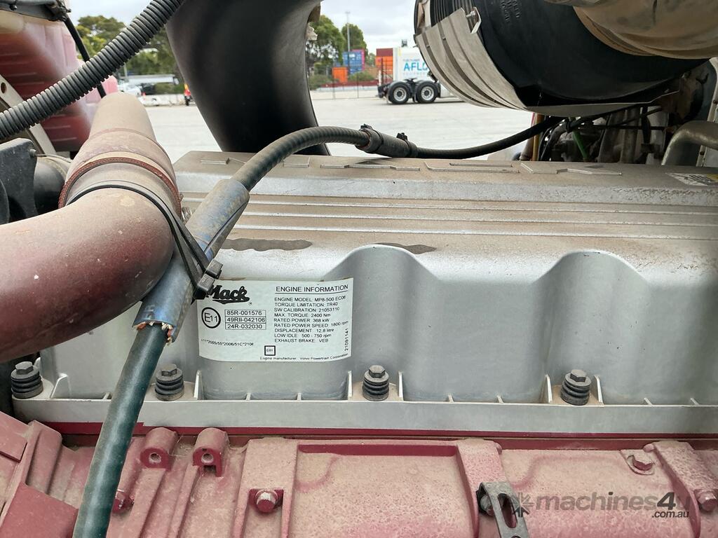 CP: 05/2010,Mack,CMMR Granite,Tipper,Manual,Air Bag Suspension,Engine #: MP8937432,Mack MP8,6 Cyl,Diesel,18 Gears,828532 (Kms. Showing on Odometer),10 (Hrs. Showing on Hour meter),Colour: White,Rego. No: XLN572 VIC,VIN: 6FMN12G69AD801594,Key No: 98,GVM: 26000,GCM: 70000,Sold with No Plates,Key No: 98