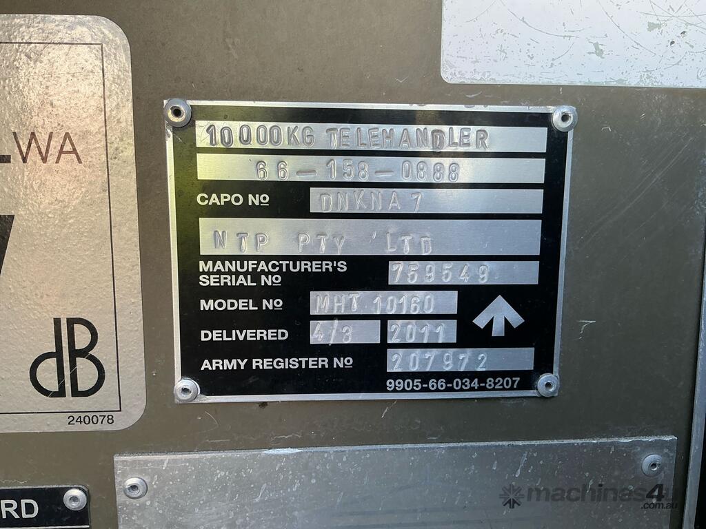 CP: CIRCA 2010,Manitou,MHT10160,Telehandler,6 Cyl,Diesel Turbo,Odometer not visible,1647 (Hrs. Showing on Hour meter),Colour: Drab Olive,Unregistered,Serial No: 759549,Sold with No Plates,Key No: 218