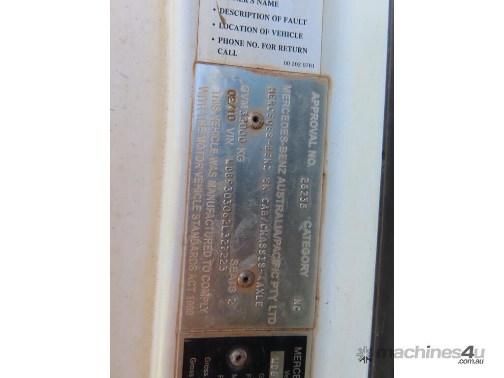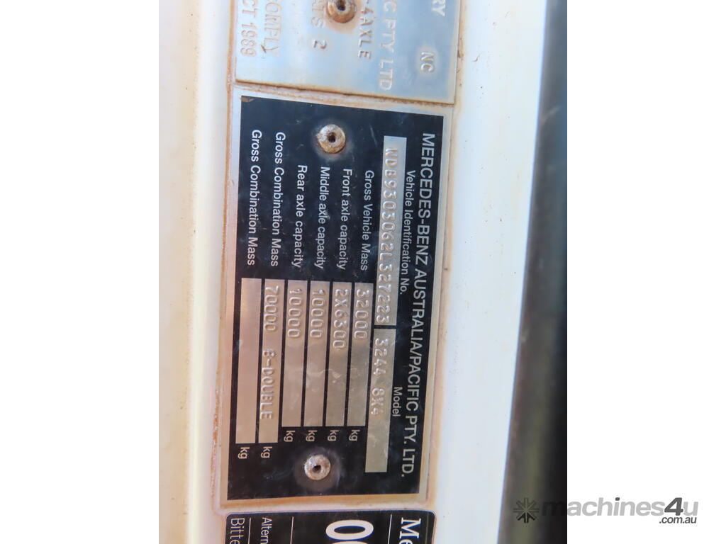 CP: 02/2010,Mercedes Benz,Actros 3244,Tanker,Spring,Engine #: 6284,6 Cyl,Diesel,Odometer not visible,Hourmeter not visible,Unregistered,VIN: WDB9303062L327223,GVM: 32000,GCM: 70000,Sold with No Plates