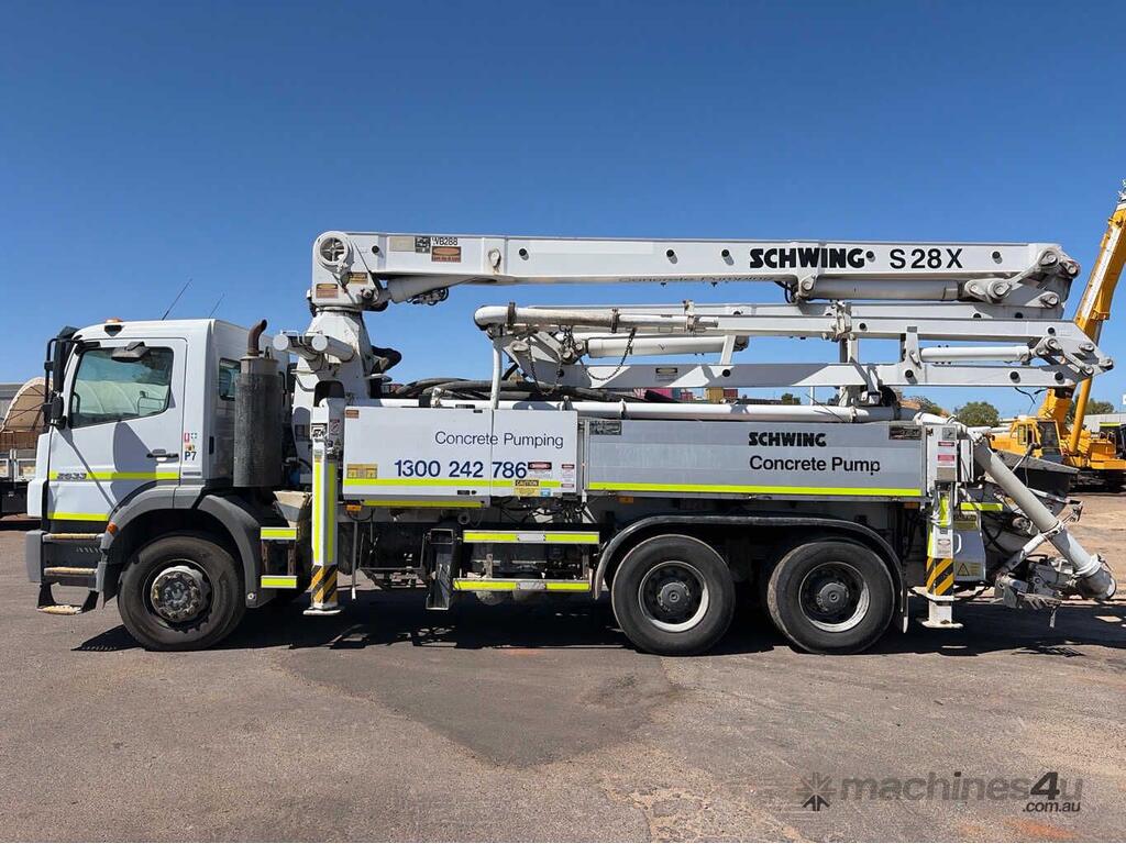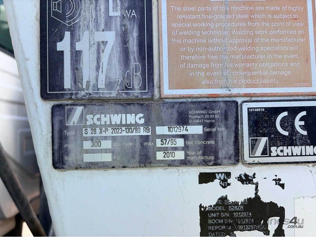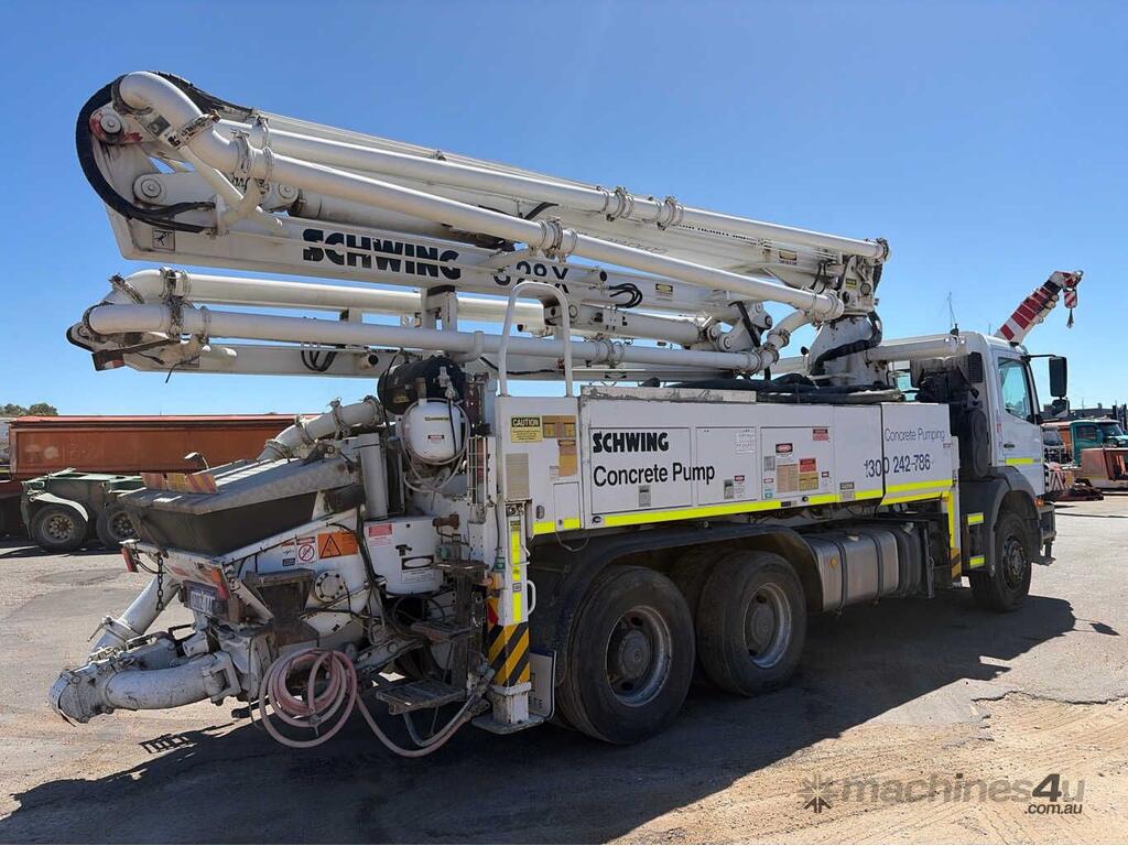 CP: 10/2010,Mercedes Benz,Axor 2633,Concrete Pump Truck,Automated Manual Transmission,Trunnion,6 Cyl,Diesel Turbo,297279 (Kms. Showing on Odometer),20448 (Hrs. Showing on Hour meter),Colour: White,Rego. No: 1DOZ146 WA,Rego expiry: 20/03/2026,VIN: WDB9506422L510654,Key No: 314,Length: 9.7 m,GVM: 26000,GCM: 30400,Plates to All,Key No: 314