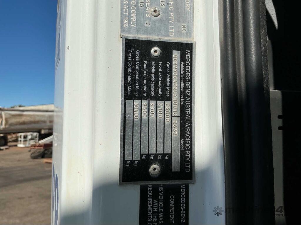 CP: 10/2010,Mercedes Benz,Axor 2633,Concrete Pump Truck,Automated Manual Transmission,Leaf Spring Suspension ,6 Cyl,Diesel,348023 (Kms. Showing on Odometer),21347 (Hrs. Showing on Hour meter),Colour: White,Rego. No: 1DOZ147 WA,Rego expiry: 20/03/2026,VIN: WDB9506422L510018,Key No: 582 R,Length: 9.6 m,GVM: 26000,GCM: 30400,Plates to All,Key No: 582 R