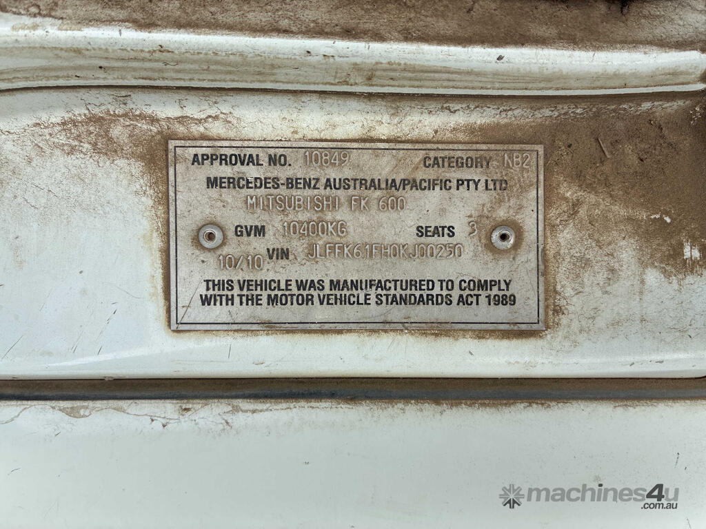 CP: 10/2010,Mitsubishi Fuso,Fighter FK600,Tipper,Manual,Spring,4 Cyl,Diesel,6 Gears,158609 (Kms. Showing on Odometer),Hourmeter not visible,Colour: White,Rego. No: NP(XQ69XE), Unregistered QLD,VIN: JLFFK61FH0KJ00250,GVM: 10400,GCM: 20000,Sold with No Plates