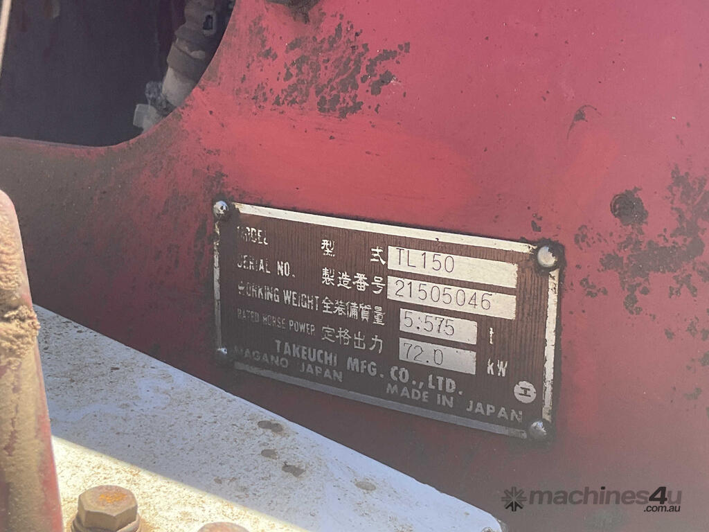 CP: CIRCA 2010,Takeuchi,TL150,Tracked Loader (Mini),Diesel,Odometer not visible,1075 (Hrs. Showing on Hour meter),Colour: Red,Unregistered,Serial No: 21505046,Sold with No Plates,WOVR Status: WOVR N/A,Incident Type: Water,Impact