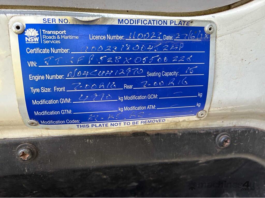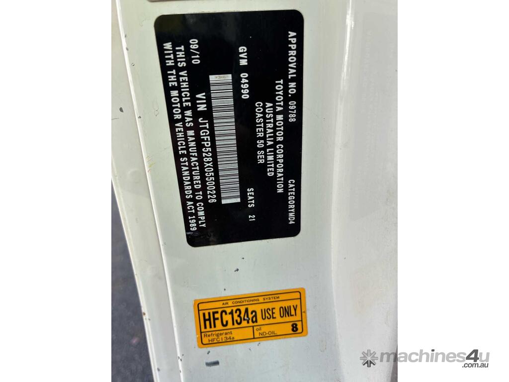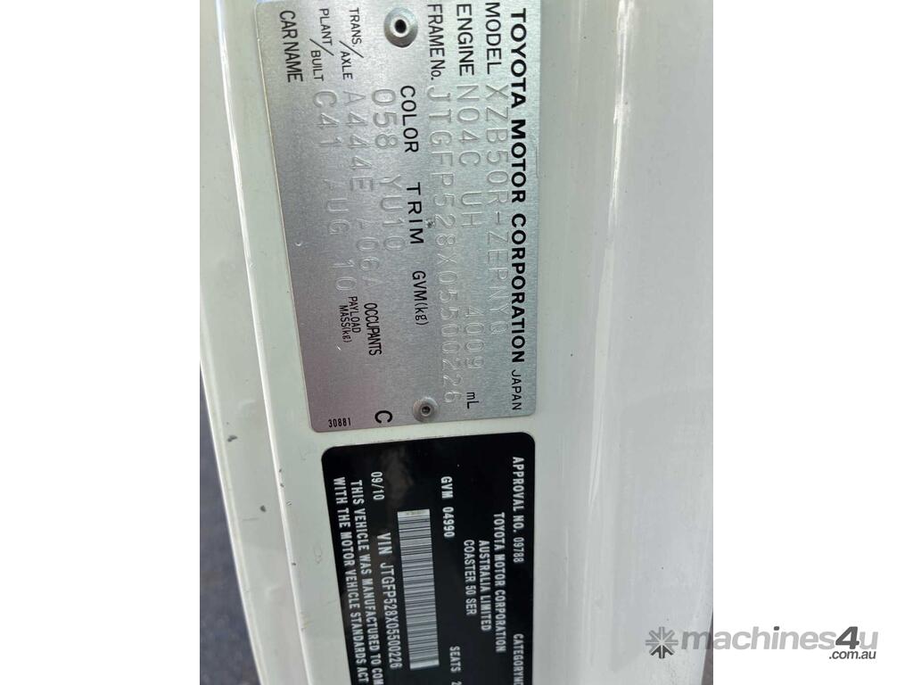 CP: 09/2010,Toyota,Coaster 50 Series,Bus,Automatic,Spring,Diesel,177886 (Kms. Showing on Odometer),Hourmeter not visible,Colour: White,Rego. No: NP(CQ27RR), Unregistered NSW,VIN: JTGFP528X05500226,Length: 6.1 M,GVM: 4990,Sold with No Plates,WOVR Status: Repairable Write-Off,Incident Type: Impact