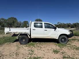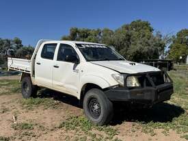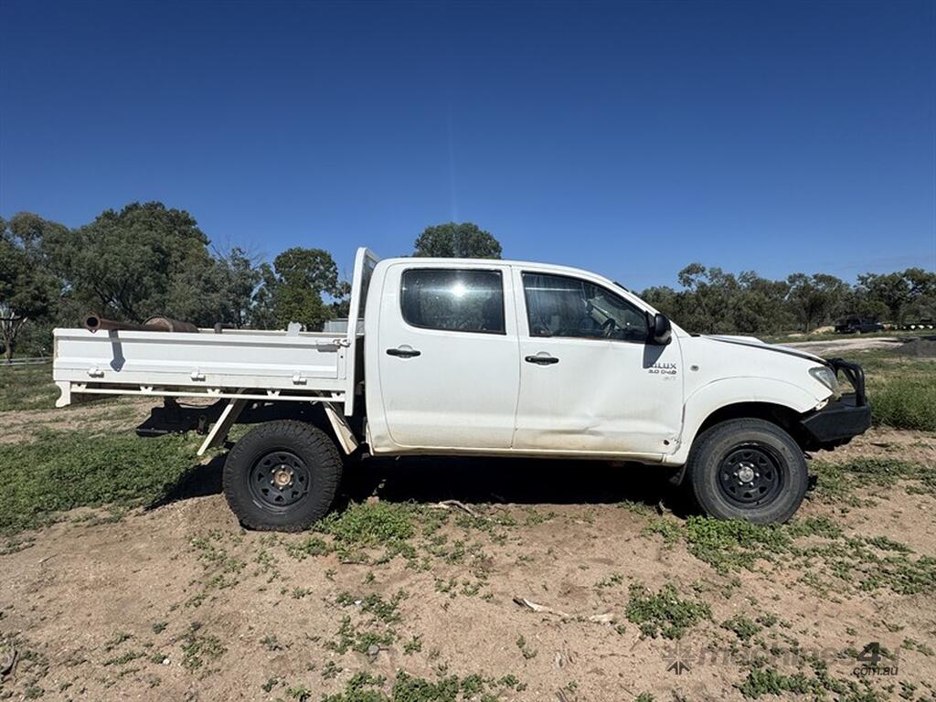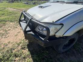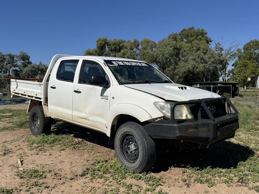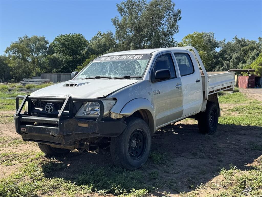 2010 Toyota SR Hilux 3.0 D-4D dual cab utility. Odometer: TBA 5-speed manual with 4WD high and low range. Bull bar fitted. Rear all-terrain tyres near new. LED tail lights. Leaf spring rear suspension. Muffler removed. Off-colour panels and windscreen damaged as per photos. Located Bourke NSW Call Andrew