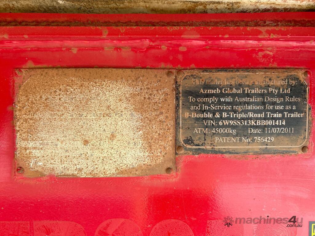 CP: 07/2011,Azmeb Global Trailers,Road Train,Tri Axle Side Tipper,Hubometer not visible,Colour: White,Rego. No: NP(820QTJ), Unregistered,VIN: 6W9SS313KBB001414,Sold with No Plates